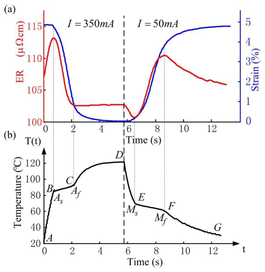 The corresponding experimental results of ER (red line) and strain (blue line) response of the SMA wire are shown in Figure 5a. During heating, the ER response is non-monotonic with a rapid increase, decrease then increase again. In segment BC, the SMA wire undergoes reverse transformation, where the ER decreases because the ER of austenite is smaller than that of martensite. In segments AB and CD, no transformation occurs, where the ER increase is due to heating. In addition, the strain changes slightly in segments AB and CD but decreases rapidly in segment BC due to reverse transformation. During cooling, the opposite characteristics of ER and strain response occur. In segment EF, the ER increases due to forward transformation while in segments DE and FG, the ER decrease is due to cooling. Churchill et al. [22] showed similar results to those presented in Figure 5a through an external heating method.