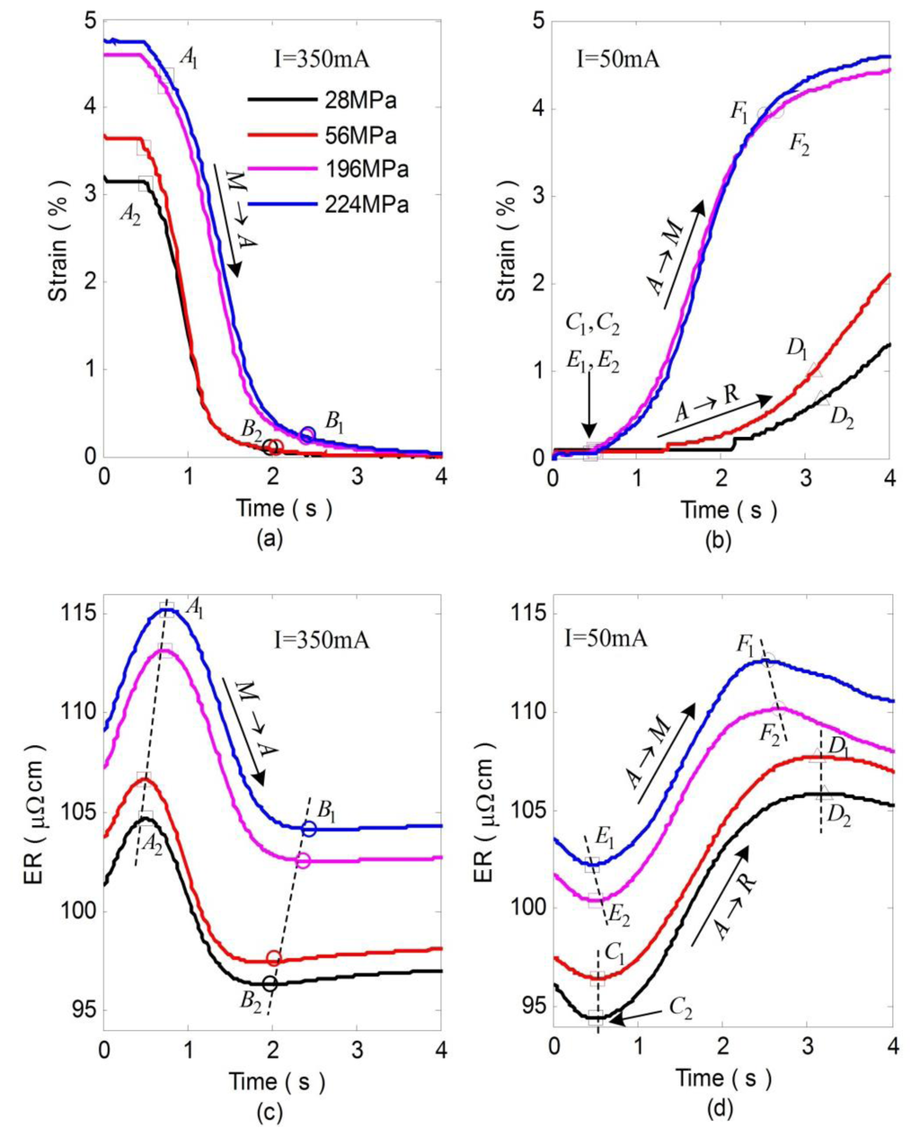 During cooling, As is shown in Figure 6d, the ER increase mainly denotes A→R transformation (from C1C2 to D1D1) and A→M transformation (from E1E2 to F1F2) when the stress is lower than 56 MPa and higher than 196 MPa. This is because all the transformation temperatures increase linearly with increasing applied stress, but Rs exhibits a stress dependence substantially smaller than that of Ms or Af [16], thus R-phase fraction decreases gradually with the increase of the stress. For stresses greater than a certain value, Ms exceeds Rs and only one step (A→M) appears during the forward transformation.