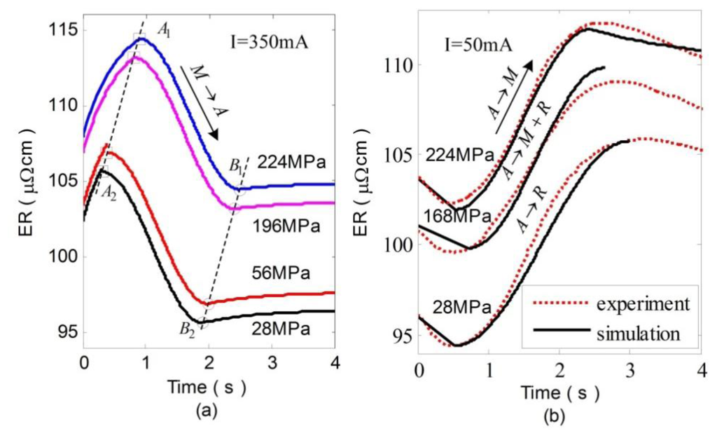 Combining Equations (1), (10), (11) with Equations (15), we derive numerical simulation of ER variations. Figure 7b shows the comparison between simulation and experimental results during cooling. When A→R and A→M occur, the simulation results are in good agreement with the experimental results. When A→R+M occurs, the model reveals a relatively large error because the ER variations represent the mixture effect of R-phase and martensite.