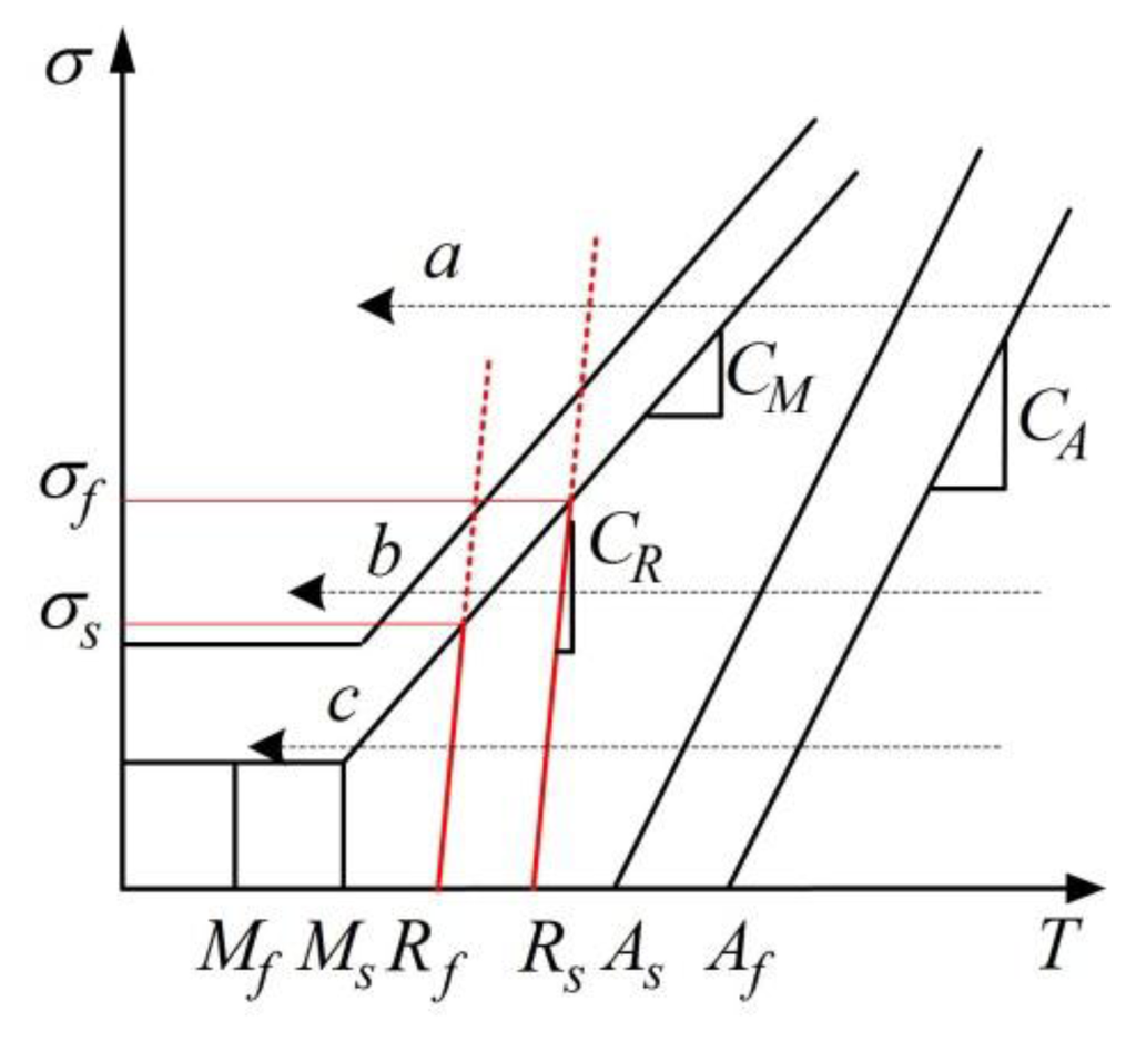 A revised critical stress-temperature plot including R-phase is shown schematically in Figure 8 to illustrate this situation. If applied stress is higher than σf, no R-phase occurs during cooling (arrow a). If stress is lower than σs, two separate steps (A→R→M) appear successively (arrow c). If stress is within the above range, two mixed steps (A→R+M) appear (arrow b). Here, three constant applied stresses (28 MPa, 168 MPa and 224 MPa) are implemented as case studies.