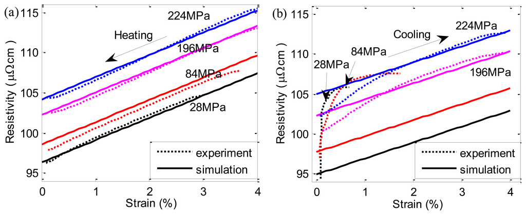 The simulation and experimental results of ρ − ε curves during M→A and A→M are shown in Figure 9. During M→A, the ρ − ε curves have good linearity. The whole resistivity value changes linearly with the stress and the simulation results agree well with the experimental results. However, during A→ M, a large error occurs between simulation and experimental results at lower applied stresses. This is due to the appearance of R-phase during cooling. With the increase of the stress, R-phase fraction decreases and the linearity becomes better.