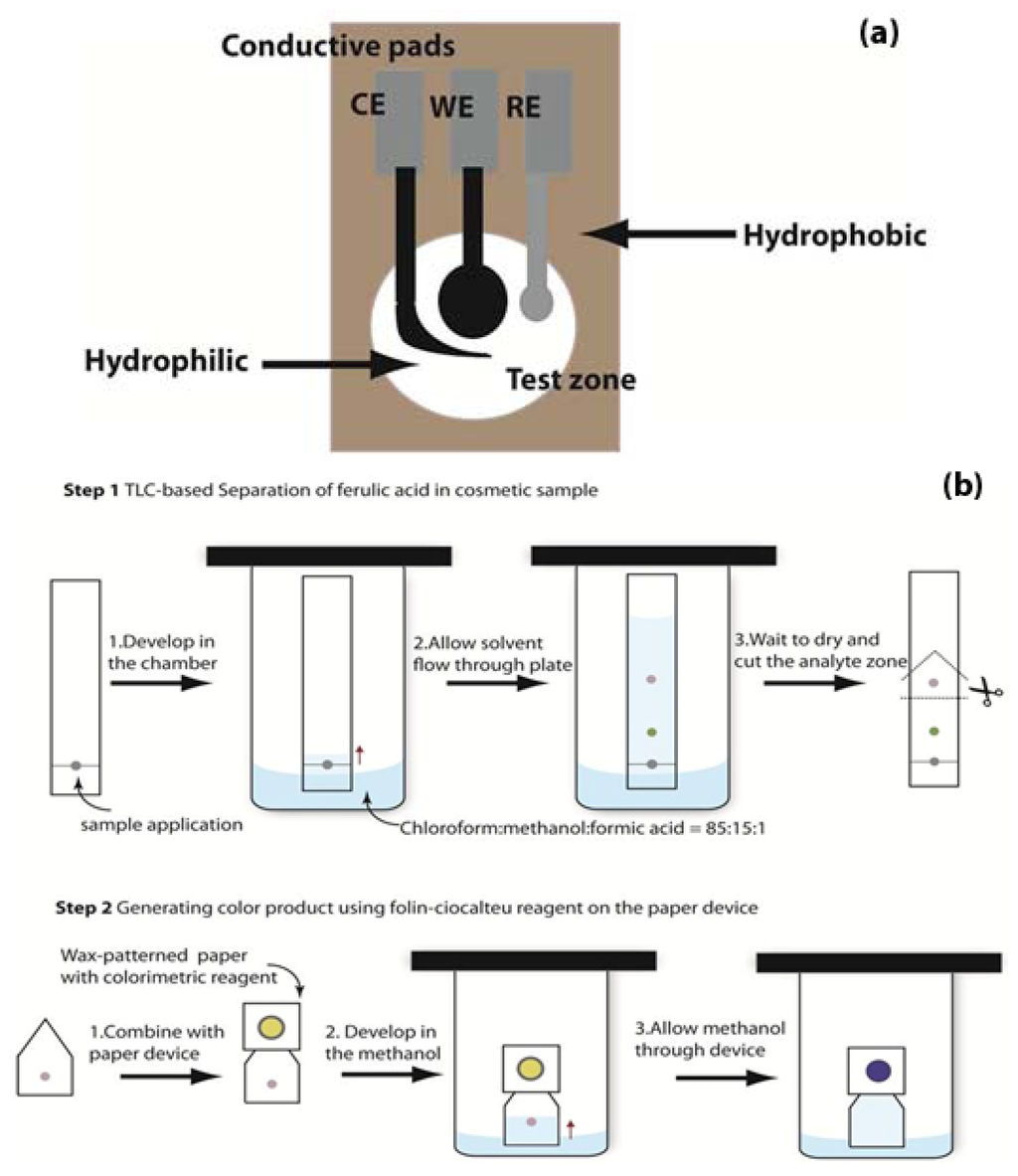 Ferulic acid is an important phenolic antioxidant found in or added to diet supplements, beverages, and cosmetic creams. Two designs of paper-based platforms for the fast, simple and inexpensive evaluation of ferulic acid contents in food and pharmaceutical cosmetics were evaluated. The first, a paper-based electrochemical device, was developed for ferulic acid detection in uncomplicated matrix samples and was created by the photolithographic method. The second, a paper-based colorimetric device was preceded by thin layer chromatography (TLC) for the separation and detection of ferulic acid in complex samples using a silica plate stationary phase and an 85:15:1 (v/v/v) chloroform: methanol: formic acid mobile phase. After separation, ferulic acid containing section of the TLC plate was attached onto the patterned paper containing the colorimetric reagent and eluted with ethanol. The resulting color change was photographed and quantitatively converted to intensity. Under the optimal conditions, the limit of detection of ferulic acid was found to be 1 ppm and 7 ppm (S/N = 3) for first and second designs, respectively, with good agreement with the standard HPLC-UV detection method. Therefore, these methods can be used for the simple, rapid, inexpensive and sensitive quantification of ferulic acid in a variety of samples.1. Introduction