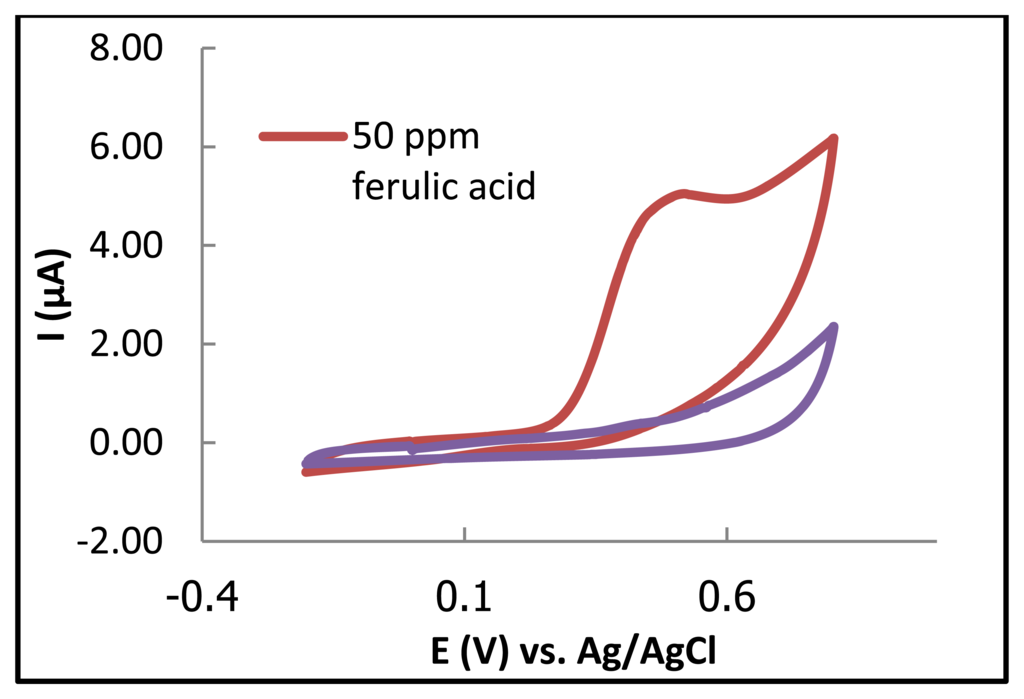 First, CV was used to investigate the electrochemistry of ferulic acid on the paper-based electrode. Sodium acetate (0.1 M) buffer, pH 5.0, was used as the supporting electrolyte because it provides a well-defined peak at the carbon electrode [23]. Ferulic acid (50 ppm) exhibited a well-defined oxidation peak during the scan of the potential toward the positive direction at the carbon electrode at approximately 0.4 V vs. Ag/AgCl (Figure 2). The precision between electrode and electrode was examined from a series of six repetitive measurements of a solution containing 50 ppm ferulic acid. Reproducible signals were obtained with relative standard deviations (%R.S.D.) of 5% for the peak current. Such good precision indicates negligible surface reproducibility of the electrode preparation.