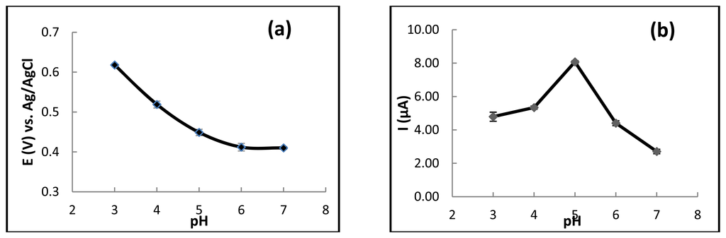 In any electrochemical detection method, the supporting electrolyte pH has a significant impact on the ionization and redox reaction of each analyte. Therefore, optimization of the supporting electrolyte pH was performed for the electrochemical detection of ferulic acid. The effect of pH (0.1 M acetate buffer) on the peak potential and oxidation current were examined in the pH range of 3.0–7.0. The relationship between the pH value and the oxidation peak potential from cyclic voltammogram (Figure 3a) revealed that ferulic acid (50 ppm) is easily oxidized as the pH increases from pH 3.0 to pH 6.0 because the potentials shifted negatively at the higher pH. Moreover, the relationship between the oxidation peak currents and pH was investigated. As shown in Figure 3b, it is evident that the highest current signal using carbon electrodes was obtained at pH 5. Accordingly, pH 5.0 was selected as the most suitable for all subsequent work.