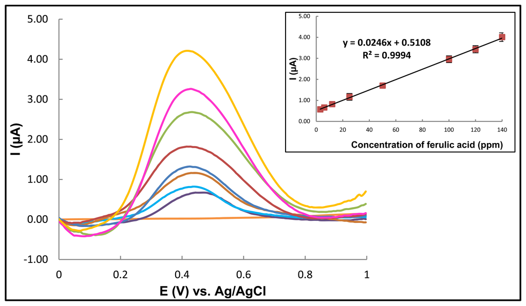 The ferulic acid solutions were investigated by DPV under optimal conditions (0.1 M acetate buffer pH 5.0, 50 mV pulse amplitude, 7 mV strip potential, and 100 mV/s scan rate). Defined peaks with currents proportional to the ferulic acid concentration in the applied sample were observed as shown in Figure 5. The oxidation peak current of ferulic acid showed a linear relationship with its concentration in the range of 3–140 ppm (correlation coefficient of R2 = 0.9994), with a sensitivity of 0.0246 μA/ppm. The limit of detection (LOD) was obtained from experiment at concentrations as low as 1 ppm, based on a signal-to-noise ratio (S/N) of 3, and the limit of quantization (LOQ) at 3 ppm based on a S/N of 10.
