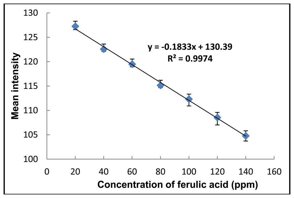 The ferulic acid standard curve was generated by using various concentrations (1–200 ppm) of ferulic acid. The derived average color intensity from three replicate runs plotted against the ferulic acid concentration (Figure 6) revealed a linear detection range between 20 and 140 ppm (R2 = 0.9974), with a LOD of 7 ppm and a LOQ of 20 ppm.