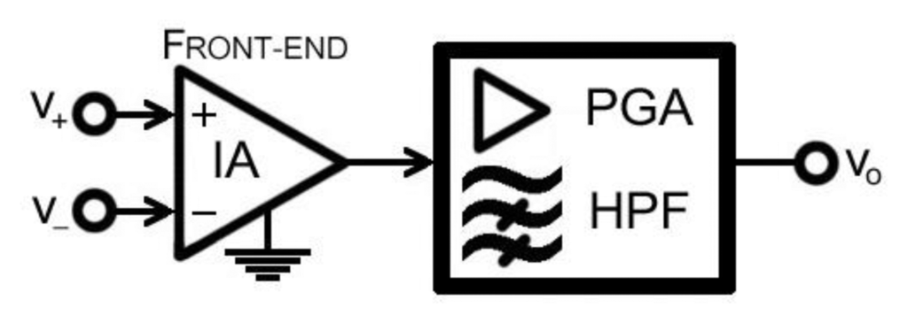 The calculated results were compared with the noise measured with an oscilloscope at the output of the test circuit in Figure 5. Extra noise is introduced by the stages located between vhpf and vo but it was a minor contribution compared to the IA and HPF gain stages contribution. In fact, the oscilloscope noise measure at vo acts as a reference to compare to, as it will exceed the IA and HPF contribution.