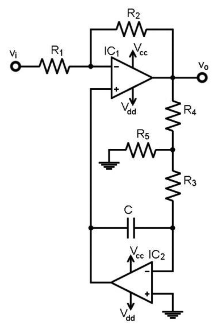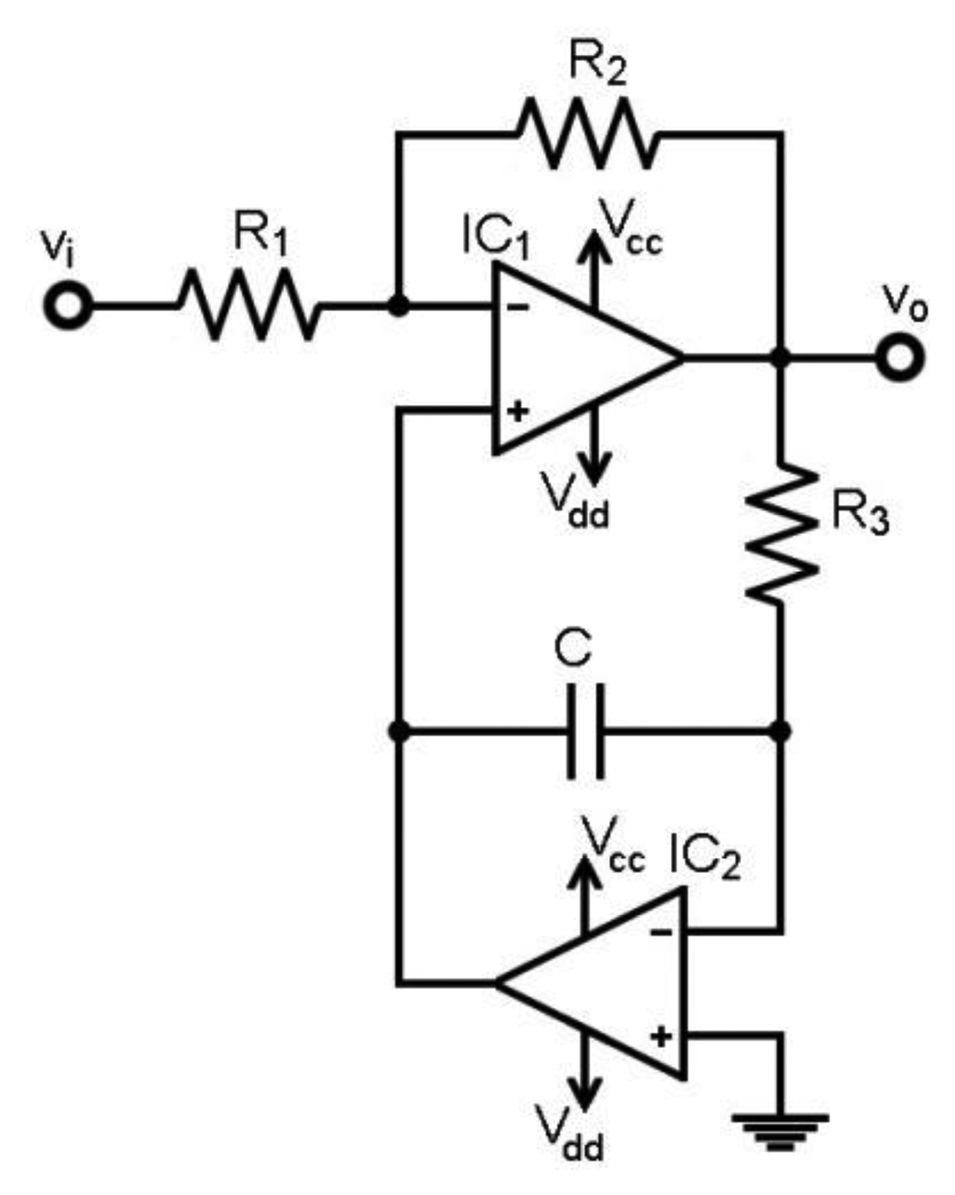 These characteristics will also be featured by the second implementation, shown in Figure 4. The feedback includes an op-amp inverting stage previous to the integrator. The transfer function is shown in Equation (6) and the HPF cut-off frequency in Equation (7):