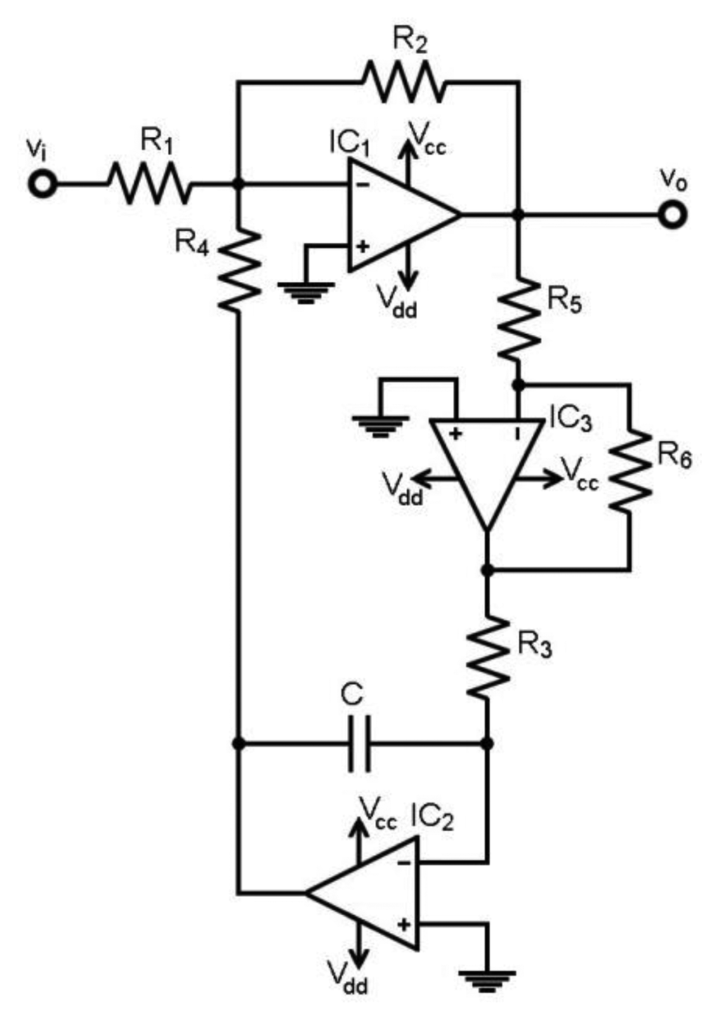 The critical path in the design depicted in Figure 3 is the branch composed by the R3-R4-R5 resistors. Here, both IB and VOS of the loop op-amp IC2 are responsible for the spurious DC levels Vo,dc. As in the previous design, IB and VOS effects are transferred to vo through the R3-R4-R5 network as described by Equation (9). IB can be highly dependent on the temperature and, hence, responsible for the thermal voltage drifts. Later on, numeric values for the thermal drifts will be given for a set of six op-amps in a trial: