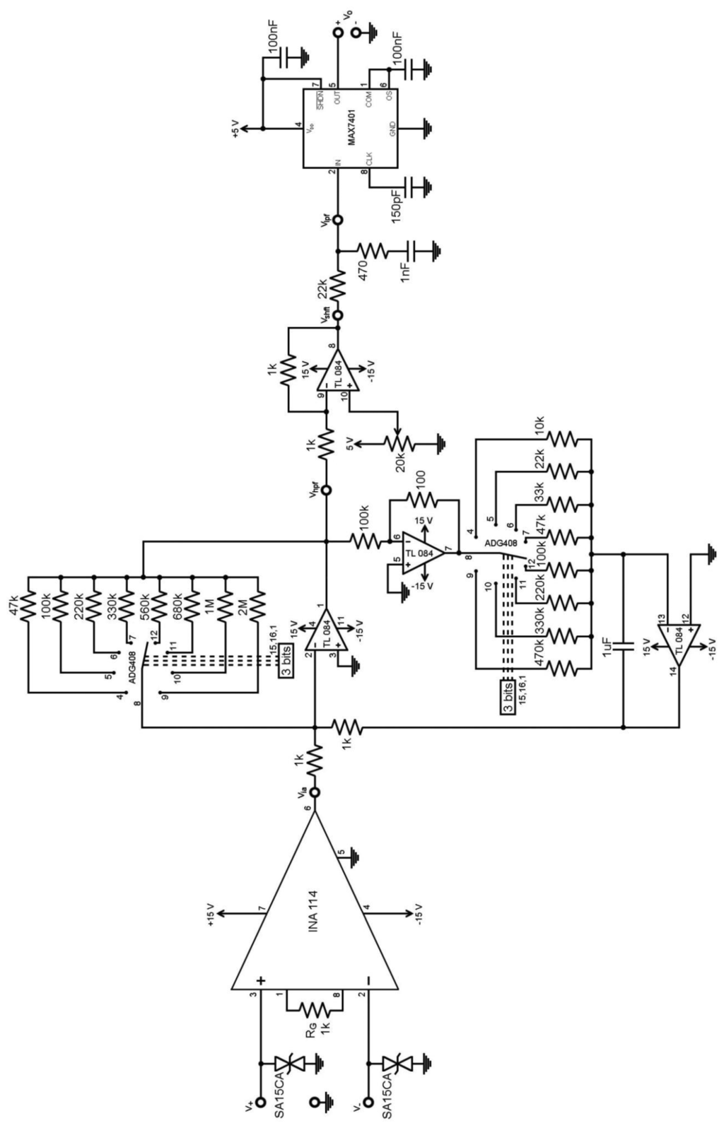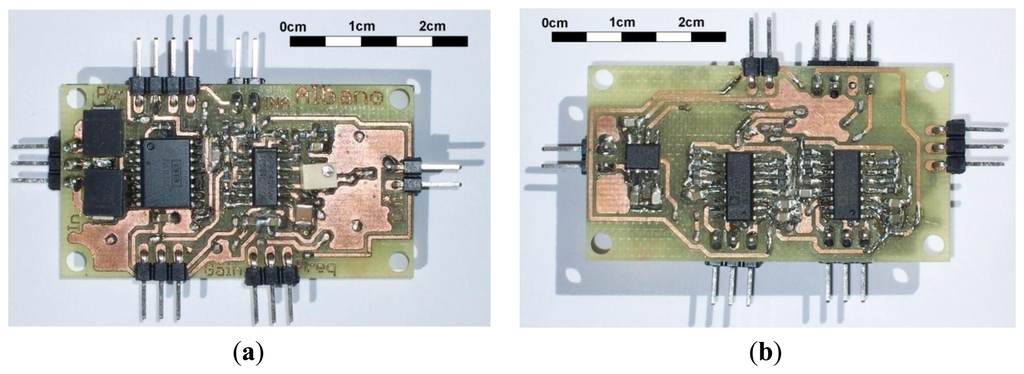 Both implementations, Figures 3 and 4, were tested with two degrees of freedom. Hence, two ADG408 analogue solid-state integrated switches were implemented to select R2 and R3 values. Then, gain and cut-off frequency can be selected by combining both switches. Each switch has three input bits for way selection, which allows for eight resistor values. Hence, there are 64 possible combinations, i.e., eight different cut-off frequencies for each of the eight selectable gains. The minimum cut-off frequency in trial was 0.016 Hz and the maximum 31.83 Hz. The switching procedure may be commanded with a digital controller.