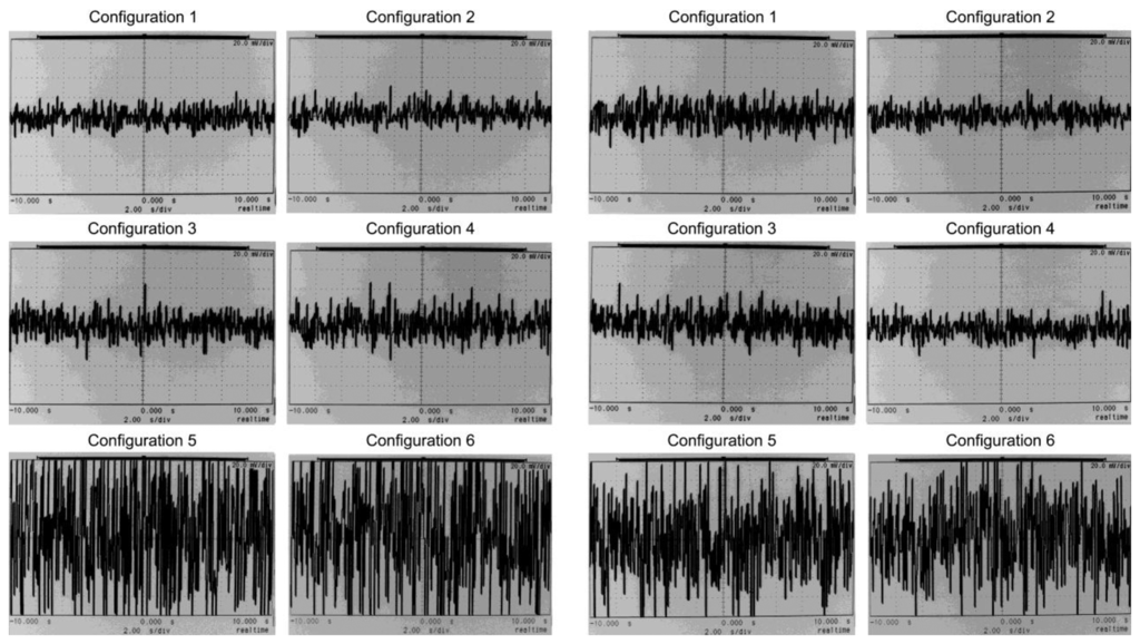 Noise was measured at the output vo of the test circuit in Figure 5 with an oscilloscope. Hence, v+ and v− inputs were grounded. The configuration set shown in Table 14 was applied to obtain a set of 6 graphs, as displayed on the left side in Figure 8. Afterwards, the HPF in Figure 4 was replaced by the HPF in Figure 3. The set of graphs obtained is displayed in Figure 8 on the right side. The time span is 20 s, so noise frequencies as low as 0.05 Hz can be observed.