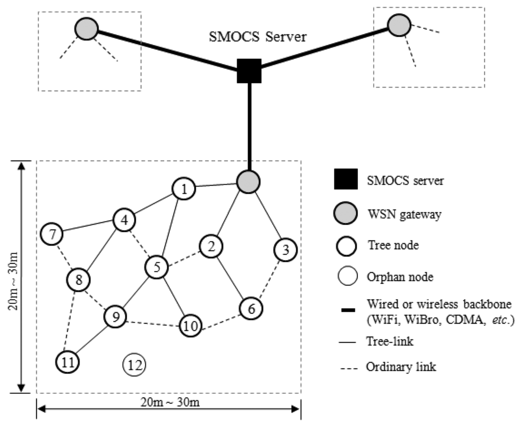 Figure 1 shows a typical network model for the SMOCS that consists of a SMOCS server, WSN gateways or sinks corresponding to the number of LPG tanks, and a number of sensor communication devices (sensor nodes). The server is wall-powered, sensor node is battery-powered, and the gateway can be either wall-powered or battery-powered. The server collects data from sensor nodes in the target environment, and analyses these data to judge whether or not a dangerous situation has occurred. Then it can send a command to a sensor node or an actuator in order to warn of the situation. The gateways connect WSNs to a backbone network that can be WiFi, WiBro and/or CDMA. Each sensor node has one wireless communication module, one battery module, and multiple sensor modules which can be switched on or off individually to conserve power. A sensor node senses data from environment periodically or by a request and sends it to the server via a WSN gateway.