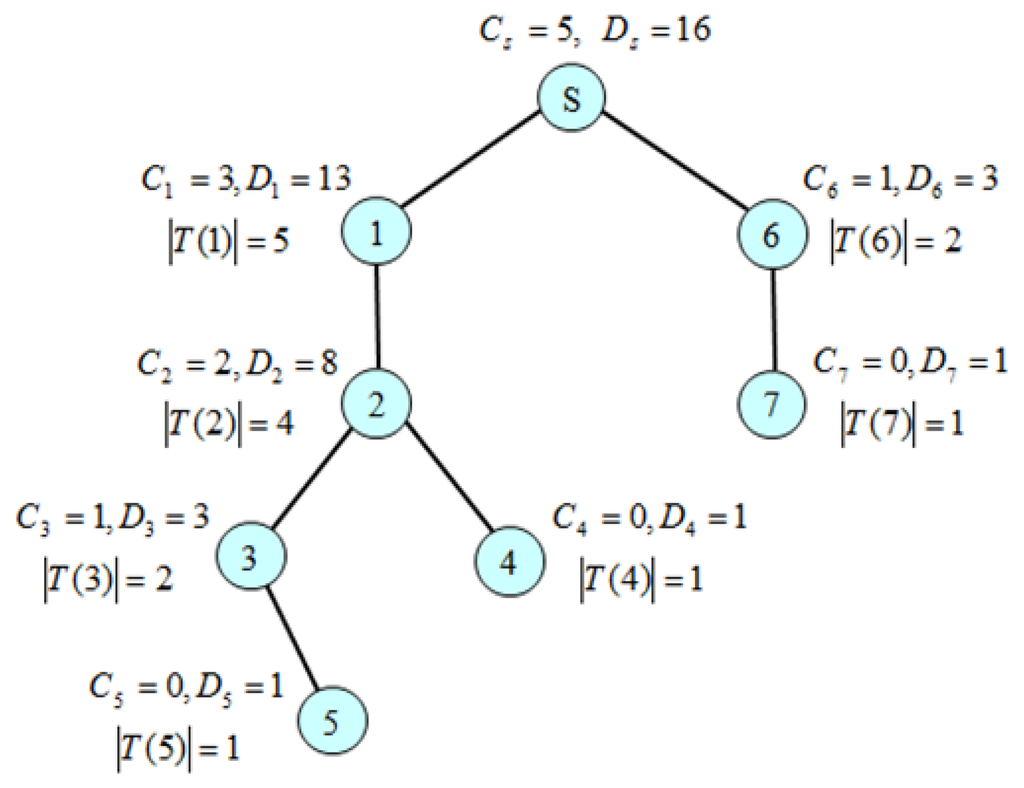 The calculation of control slot demand and data slot demand is performed from leaf nodes up to a sink node recursively according to Definition 2 and Definition 3. We use a Slot Demand Calculation message (SDC_MSG) expressed as SDC_MSG = (Ci, Di, |T(i)|) where Ci and Di corresponds to the number of control slots and data slots that a node i demands from its parent p(i), respectively. A leaf node sends SDC_MSG = (0, 1, 1) to its parent since it does not have to send control message, but has to send one data packet to its parent. An intermediate node i waits until it receives all SDC_MSGs from its children, and then calculates Ci and Di. Then, it sends SDC_MSG to its parent. Eventually, the sink s can obtain Cs and Ds, assuming that none of SDC_MSGs is missing. A timer is used to prevent the locking of the algorithm from the missing of message. Since every node has to send SDA_MSG once, the complexity of message transmission of the SDC algorithm is Θ(n) when n is the number of nodes. Figure 10 shows a slot demand calculation example by the SDC algorithm. Since a leaf node does not have to forward a control message, but has to send one data packet, C4 = C5 = C7 = 0 and D4 = D5 = D7 = 1. In this way, C1 = 3, D1 = 13 and C6 = 1, D6 = 3. Finally, we get Cs = 5 and Ds = 16.