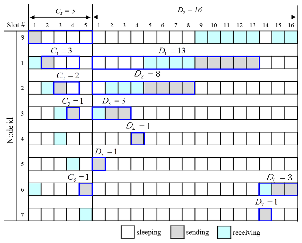 Figure 11 shows an execution example of the SDA algorithm for the simple tree shown in Figure 10. Since the sink S sends only the control message, it takes control slot #1 as the start control slot, but does not need any data slot for transmission. So, it distributes (Cs−1) control slots and Ds data slots to nodes 1 and 6 according to their demands: C1 = 3, C6 = 1, D1 = 13, D6 = 3. It sends SDA_MSG = (((1, 2, 1), (6, 5, 14)), sysTime()). Node 1(6) takes slot #2(#5) as the start control slot according to Equation (12) and slot #1(#14) as the start data slot according to Equation (13). Node 1 distributes eight slots to its only one child 2 and reserves |T1| = 5 data slots for its transmission from the rear. Furthermore, node 1 wakes up at the slot 5 according to Equation (15) to receive data from node 2 and wakes up at slot 9 (remains waken up in this case) according to Equation (16) to send data to its parent S.
