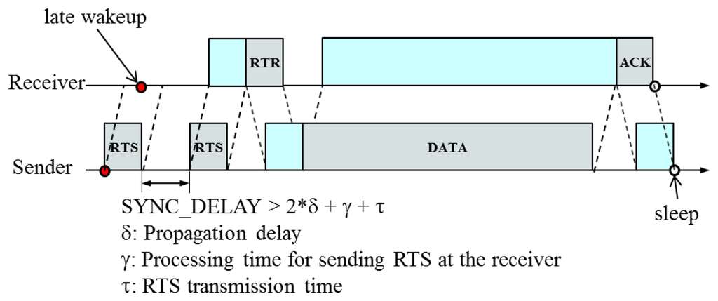 Considering the drift of the synchronized time such that a receiver wakes up later than a sender, we use the following data transmission procedure: a sender sends RTS to its parent to check if the receiver (its parent) is ready, and then waits either until it receives RTR or for the specified time, SYNC_DELAY > 2 * δ + γ + τ, where δ is a propagation delay, γ is a processing delay and τ is a transmission delay. It repeats this process for the specified number of times, MAX_TIMES (=2 in this paper) until it receives RTR. If it still does not receive RTR, the sender determines that the corresponding link is broken. If the sender receives RTR, it starts sending DATA to the receiver. During data transmission, DATA also can be lost due to the breakage of the corresponding link. Thus, the receiver responds with ACK to indicate that it has received DATA successfully. Figure 12 illustrates the reliable data transmission scheme.