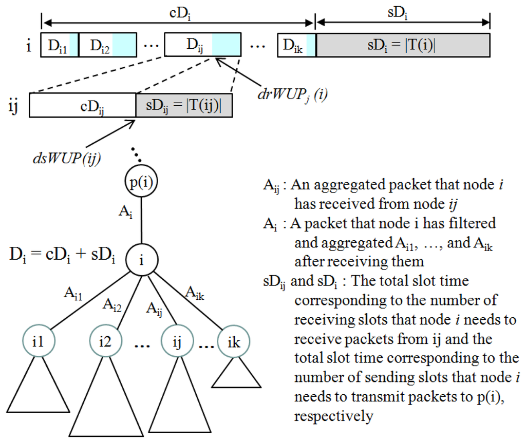 Node i is allocated the |T(ij)| receiving slots by the SDA algorithm to receive |T(ij)| packets from its child ij. Since node ij use filtering and aggregation mechanisms: