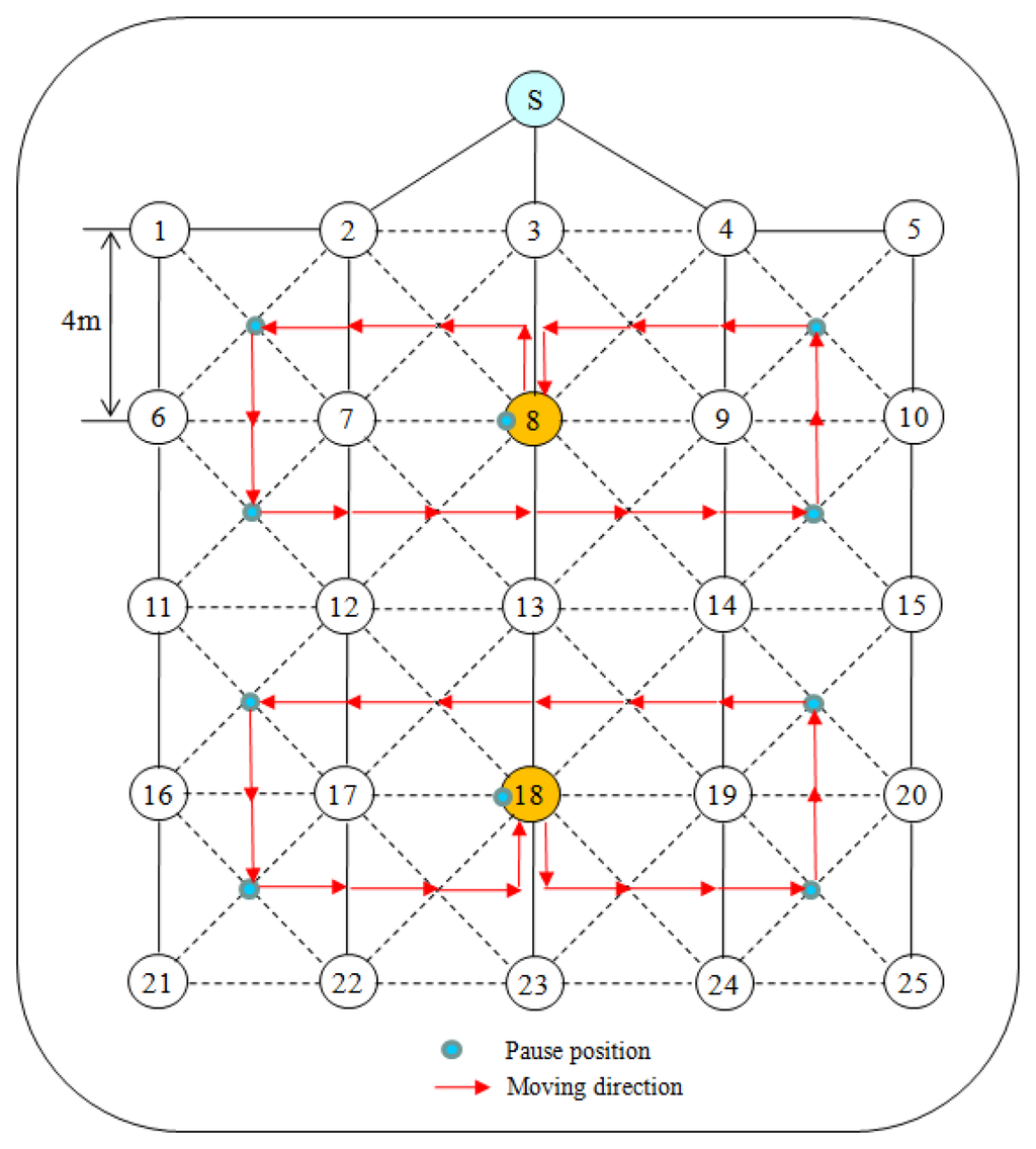 Twenty five sensor nodes are artificially distributed in a 5 × 5 grid of the experimental area, making equal distance of about 4 m between the neighbor nodes in vertical or horizontal directions as shown in Figure 14. The solid lines indicate tree links and the dotted lines indicate ordinary links between two neighbor nodes.
