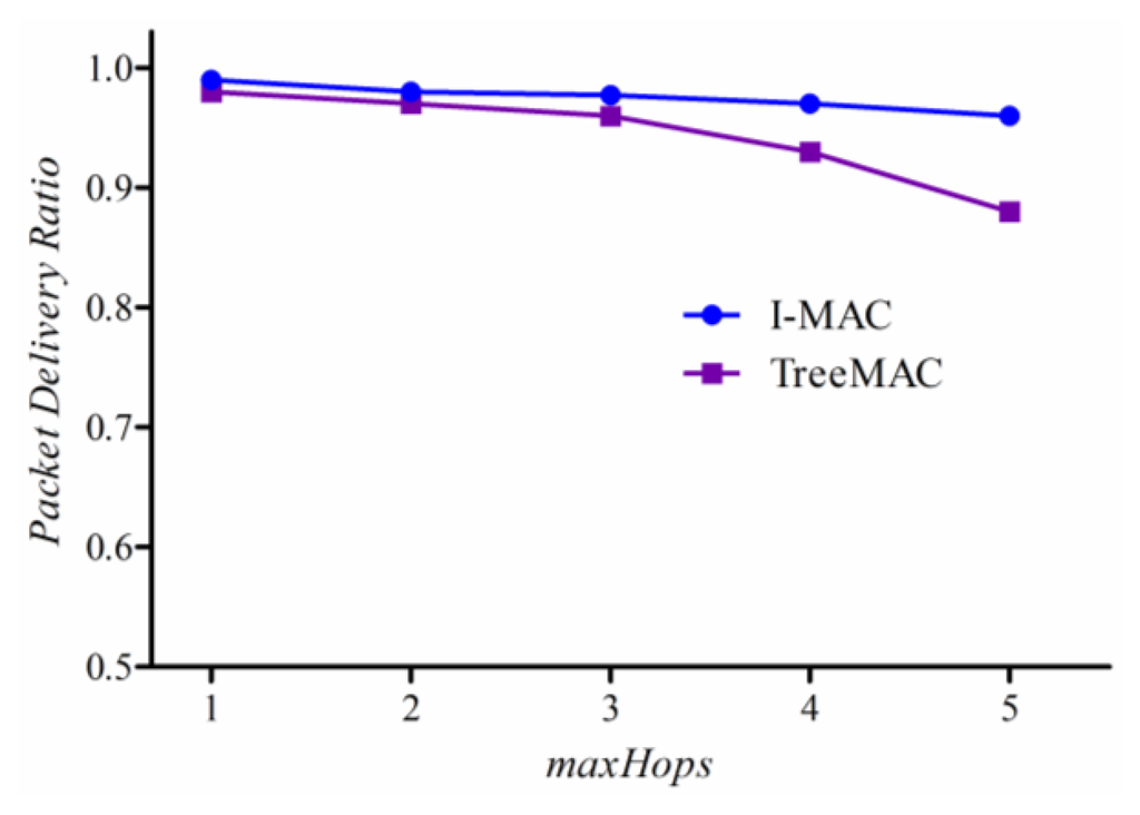 Figure 15 compares PDR of I-MAC and TreeMAC according to variation of maxHops (the maximum distance in hops from sources to a sink). When maxHops ≤ 3, I-MAC and TreeMAC achieve high PDR with a little difference because no nodes transmit data packets at the same time that can cause interference (slot reuse does not apply in TreeMAC when maxHops ≤ 3). The packet delivery ratio of I-MAC sustains over 0.96 overall while that of TreeMAC decreases down to 0.87 as maxHops increases up to 5.