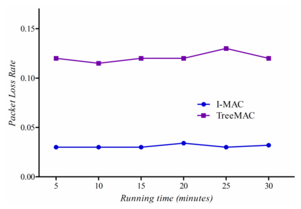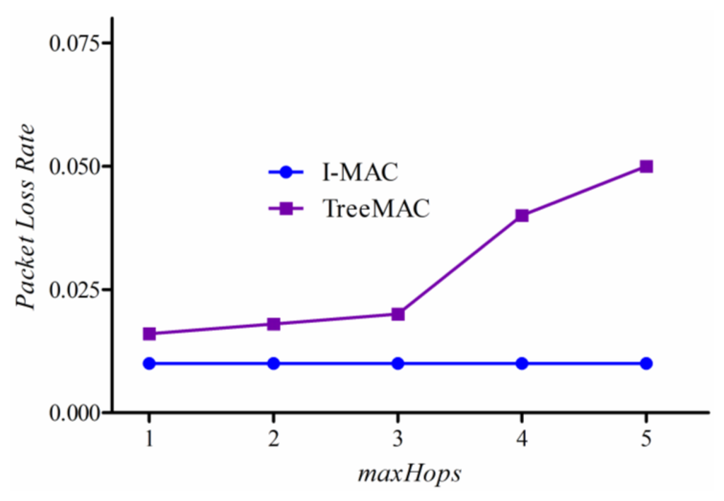 Experimental results are shown in Figure 16. The packet loss rate of TreeMAC increases quickly with the scenario with maxhops = 4 and the scenario with maxHops = 5 since the nodes at depths 1 and 4, and also the nodes at depths 2 and 5 can interfere due to the reuse of slots. Note that the other factors such as node mobility, node failure, and battery depletion were not taken into account in this experiment.