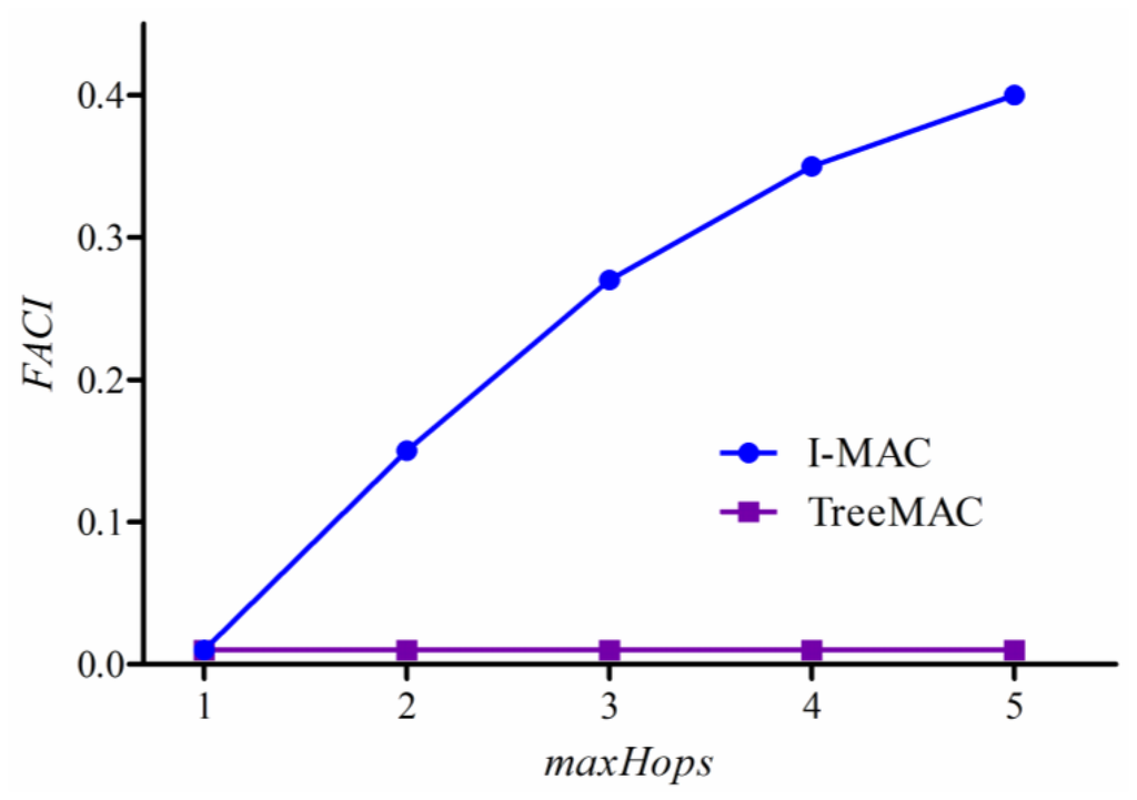Figure 17 shows that I-MAC has a good capability of filtering and aggregation while TreeMAC does not have a notable capability. I-MAC shows the better FACI with the increase of tree depth or maxHops, thereby reducing the number of received bytes by 40% with maxHops = 5.