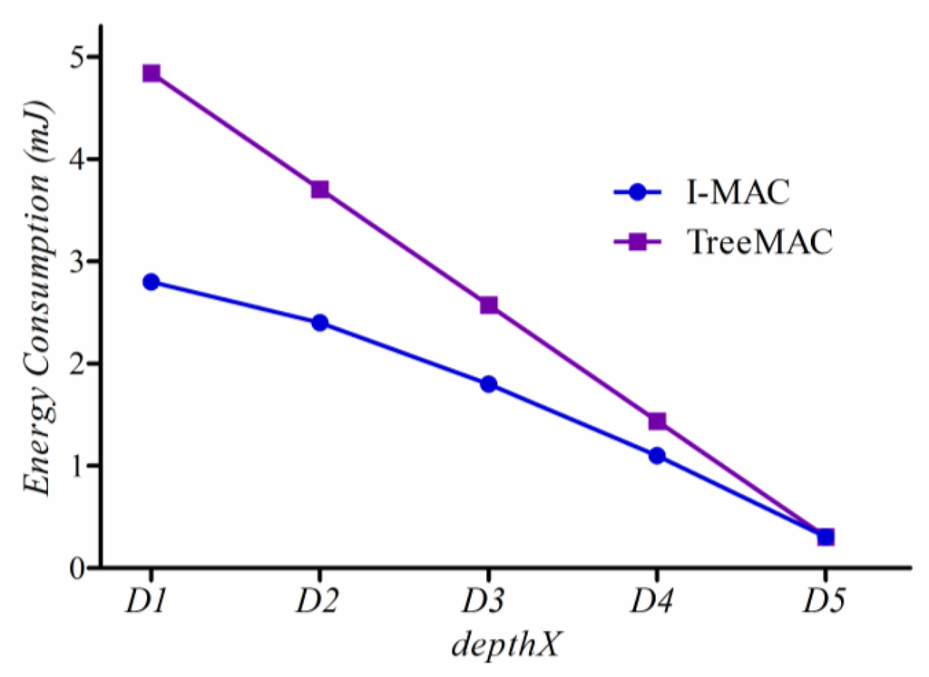 Figure 18 shows how much energy a node located at a particular depth consumes, where depthX indicates the distance in hops from the source to the sink. In TreeMAC, energy consumption increases rapidly as the depth of node decreases; whereas, I-MAC has a slow increasing curve due to the superior capability of filtering and aggregation. We can see that nodes located at depth 1 improve energy consumption by more than 40%. We can conjecture that the considerable alleviation of the imbalanced power consumption will increase network lifetime.