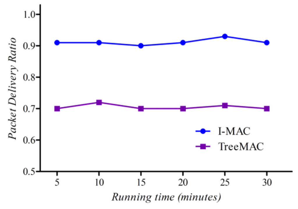 These results show that it is almost impossible to achieve 100% of packet delivery ratio in real applications in WSNs, even in one-hop network (as also shown in Figures 6, 7 and 8). A sender may not transmit data packets successfully to a distant receiver due to the effects of signal attenuation, path loss, shadowing, fading or external interference, etc. To mitigate this problem, I-MAC employed a mechanism to improve the reliability of packet transmission by building a tree topology with the bi-directionally reliable links.