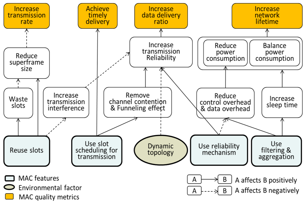 Firstly, the use of the TDMA method eliminates channel contention and funneling effect, thus enabling the timely delivery of packets and increasing transmission reliability. However, it tends to degrade throughput in low traffic networks and needs global time synchronization. In addition, some applications need a bi-directionally reliable communication; however, producing a slot schedule for bidirectional communication is not easy or increases the complexity of any scheduling algorithm.