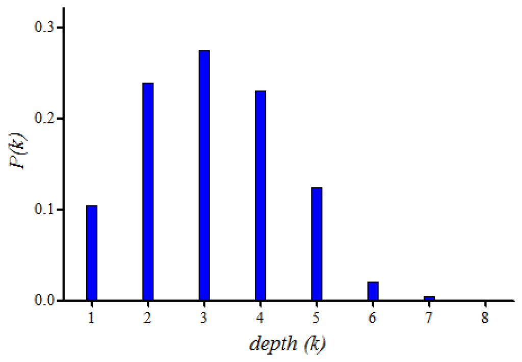 Figure 3 shows the probability mass function P(k) of random variable depth (k) when the number of nodes (nNodes) is 25, the transmission range (r) of a node is 5 m, and dimension (a) is 25 m.