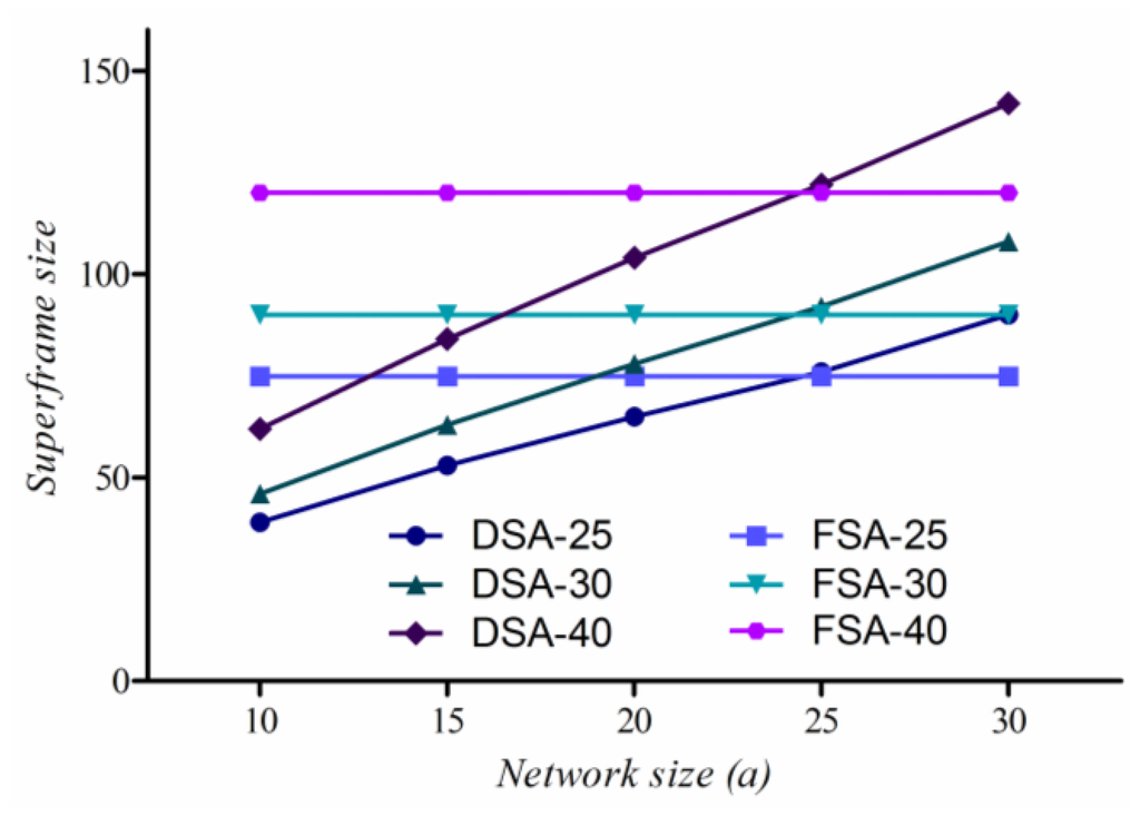 In FSA, each node requires one unique frame of three slots. Therefore, the superframe size of FSA, s(FSA), is given by: