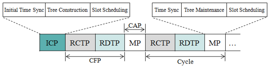 In the ICP, initial time synchronization, tree construction, and slot scheduling are performed. The slot scheduling allocates sufficient slots to each node for sending control messages and data packets in every cycle. In the following RCTP and RDTP, the control messages are delivered to either all nodes, a group of nodes or a particular node and data packets are delivered from sensor nodes to a sink, respectively according to the slot scheduling scheme. In the MP, the maintenance activities such as time synchronization, tree maintenance, and slot scheduling are performed.