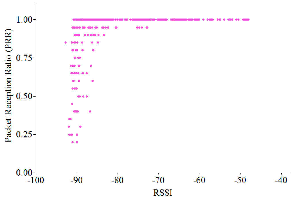 We performed several experiments to evaluate the effectiveness of RSSI, LQI and PRR in link quality estimation using TelosB motes running TinyOS 2.1 in an indoor office. One pair of nodes (sender and receiver) is used for data collection. In each experiment, the sender transmits a burst of 1,000 consecutive packets to the receiver with the transmitting power level of −25 dBm. We observe the variation of PRR, RSSI and LQI values for each received packet and calculate their mean values for each experiment. Then we repeated the experiment by changing the distance between the sender and the receiver, increasing 0.1 m each time. As shown in Figure 6, RSSI can only differentiate between the very good links and the rest ones while it is hardly distinguishable between bad, average and good links. Figure 7 shows the relationship between LQI and PRR.