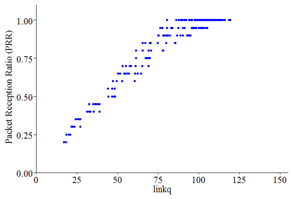 Figure 8 shows the relationship between linkq and PRR. We use an observation window of 20 packets. From this observation, we can see that linkq has a more linear relationship with PRR, since it combines the information embedded in all the individual metrics. This result shows that linkq can provide a quick and reliable assessment of the link quality.