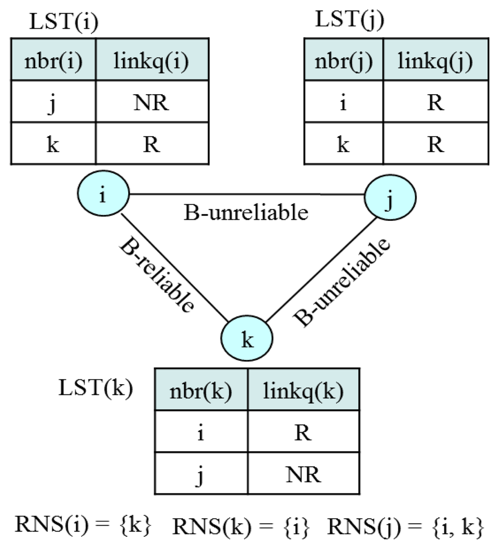 We define link (a, b) to be bi-directionally reliable (B-reliable) if and only if two directional links from a to b and from b to a are reliable. Some approaches detect the bi-directional link by explicitly exchanging control messages [35]. However, this causes high overhead and lowers detection reliability since the control messages can be lost due to collision or some other reasons. Hence, in this paper, we propose a new approach to identify the bi-directionally reliable link. Every node i, maintains its link state table, LST(i) = (nbr(i), linkq(i)), where nbr(i) denotes a neighbor of node i and linkq(i) indicates whether link (nbr(i), i) is reliable (R) or not reliable (NR). Then, let us define a reliable neighbor set (RNS(i)) as a set of neighbors who is reliable to node i. Then, every node i is required to include RNS(i) in a control message. Thus, LST(i) is updated whenever node i receives or overhears any control message from its neighbor. If a node does not receive or overhear any control message from a reliable neighbor within a specified time bound, LST_UpdBound, it removes the neighbor from its neighbor list. Then, a node i that has obtained the RNS(j) from node j determines link (i, j) to be B-reliable if entry j of LST(i) is R and i ∈ RNS(j). Figure 9 illustrates the determination of a B-reliable link.