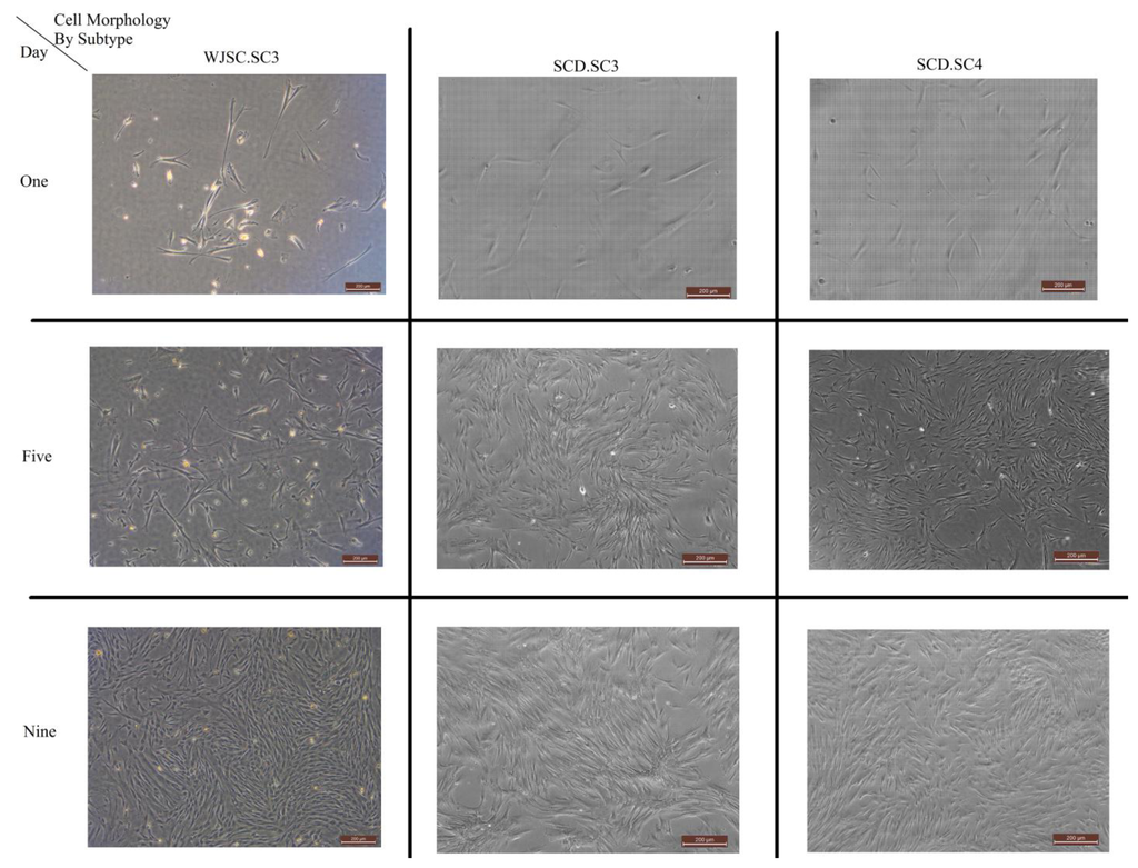 Figure 1 shows the morphology growth of the sub-cultures, divided by type of sub-culture and taken at Days 1, 5 and 9. The images are captured using a Leica DM16000B inverted phase contrast microscope.