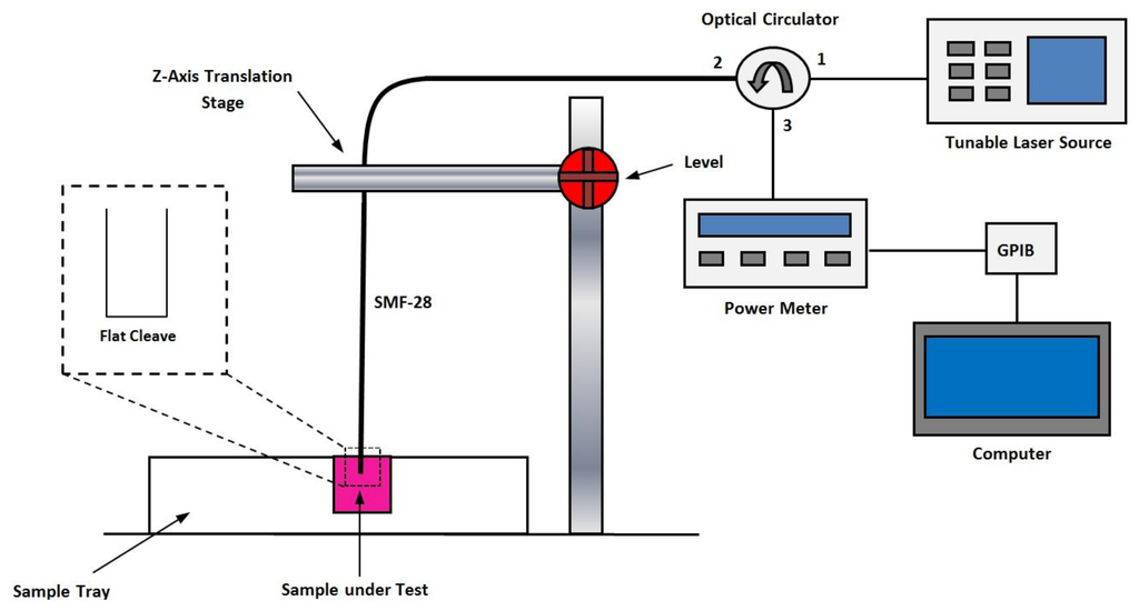 The setup of the proposed optical sensor system is given in Figure 2. A Yokogawa AQ2200-136 tunable laser source (TLS) acted as the signal source for the sensor, and was connected to Port 1 of an optical circulator (OC). Port 2 of the OC was connected to a 1 m long single-mode fiber (SMF-28) with a flat cleaved end. The flat cleaved end served as the sensor by means of Fresnel reflection [30] while the remaining length of the SMF-28 served as a bi-directional transmission medium for the sensor signal. A Nivoc A1362M Universal Clamp and ND121 Clamp Holder translation stage, capable of moving in the vertical axis, was used to lower and raise the sensor head into the sample being tested. The translation stage allowed for the complete immersion of the sensor head. The immersion depth was deemed immaterial so long as the face of the fiber was completely immersed in the conditioned media samples; however, to maintain consistency the translation stage was used to ensure that the immersion depth was 2 mm. Port 3 of the OC was connected to an ILX Lightwave OMM-6810B optical power meter (OPM). The OPM was equipped with a general-purpose interface bus (GPIB) interface, and was connected to a LabVIEW equipped computer to automate the data acquisition process.