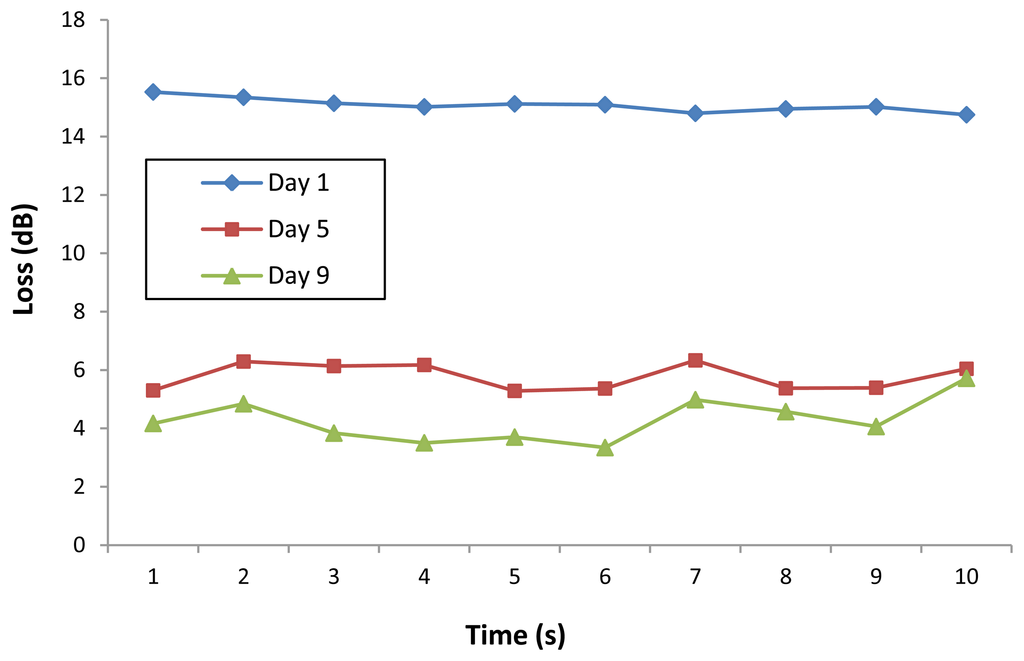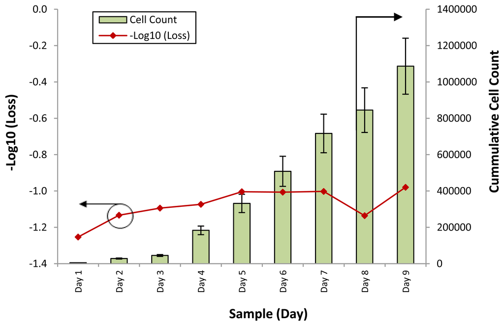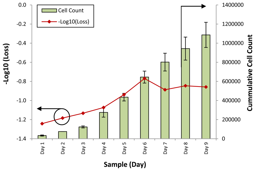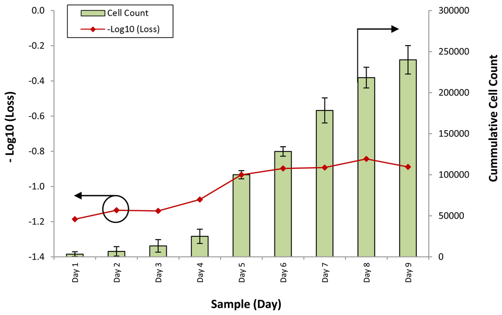 It can be seen that the response of the sensor, in the form of −Log10 (Loss), is similar to the growth rate of the cumulative cell count. At the initial stage of the experiment, from days 1 to 4, the response of the sensor rises slightly, from a value of −1.2 to about −1.1 as the cumulative cell count increases from 3,333 to 2,500. However, on Day 5, the cumulative cell count increases substantially to approximately 100,000, with a corresponding increase in the −Log10 (Loss) readings of the sensor to −0.9. Further increases in the cumulative cell count also result in changes in the response of the sensor, which increases to between −0.8 and −0.9 on the last days of the experiment.
