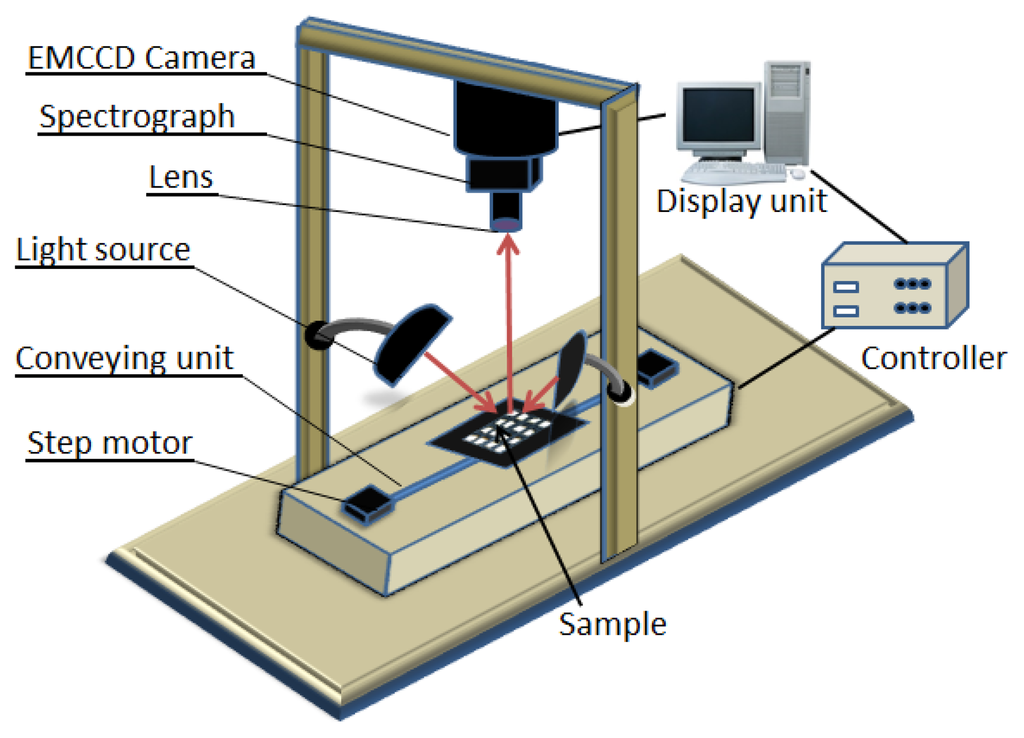 Chicken samples were placed in the sample holder to restrict the sample displacement and transported to a conveyor unit. The conveyor speed, field of view (FOV), motor speed, exposure time, and wavelength were controlled using Visual Basic software. When the sample moved within the FOV, the images and spectra were acquired by the EMCCD camera and sent to a computer for storage and post processing. The acquired hyperspectral images were stored as a hyper-cube consisting of two spatial dimensions (x and y) and one spectral wavelength dimension (λ) from which both the physical and the chemical properties of the samples could be obtained.