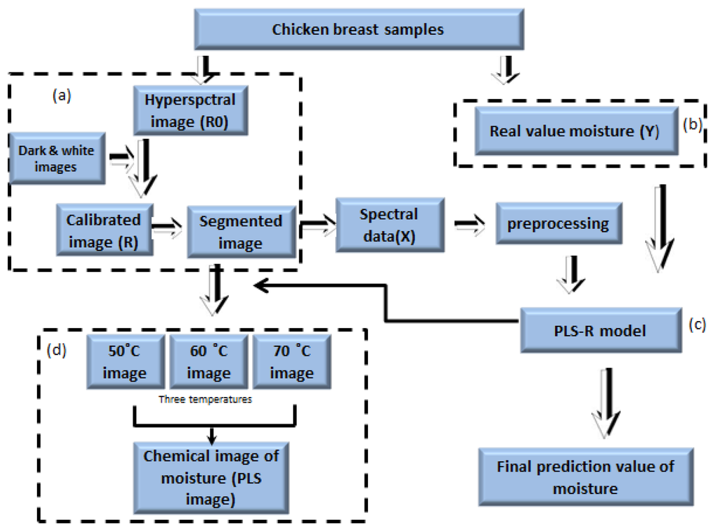 An instrumental method, such as hyperspectral imaging, in combination with a multivariate data analysis technique, such as partial least squares regression, can provide reliable information on visualizing quality in meats such as beef, pork, chicken, and fish [7,8]. Near infrared (NIR) hyperspectral imaging is a rapid, non-destructive, and accurate technique that can provide useful measurements of meat properties without requiring sample preparation. Hyperspectral imaging (HSI) is a three-dimensional technique, consisting of both images and spectra, which yields physical and chemical information. These hyperspectral techniques are the best potential tool for measuring the water content and distribution in the meat samples [9]. This information cannot be obtained using any other conventional technique. For this reason, we apply hyperspectral imaging techniques to determine the moisture content in cooked chicken breast meat with the following objectives: (a) Establish a visual/near infrared (VIS/NIR) hyperspectral imaging system (400–1,000 nm) for obtaining spectrum of the cooked chicken breast samples. (b) Develop a PLSR model to analyze the spectral data among the measured moisture values and identify the effective wavelength related to the meat water content. (c) Develop image processing algorithms for the visualization of chemical images of the moisture at three different temperature variations.