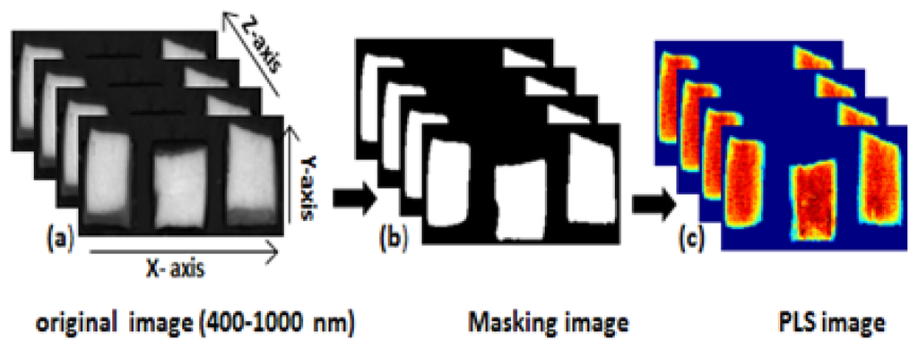 To obtain a moisture concentration map for the samples, a PLSR image was generated by multiplying the beta coefficient from the PLSR model with the spectrum of each pixel in the image. In order to remove the background, a masking image was generated for the PLSR images as mentioned in Figure 3. The PLSR image algorithm is given by: