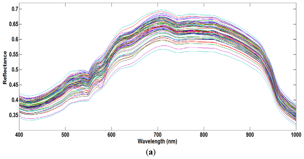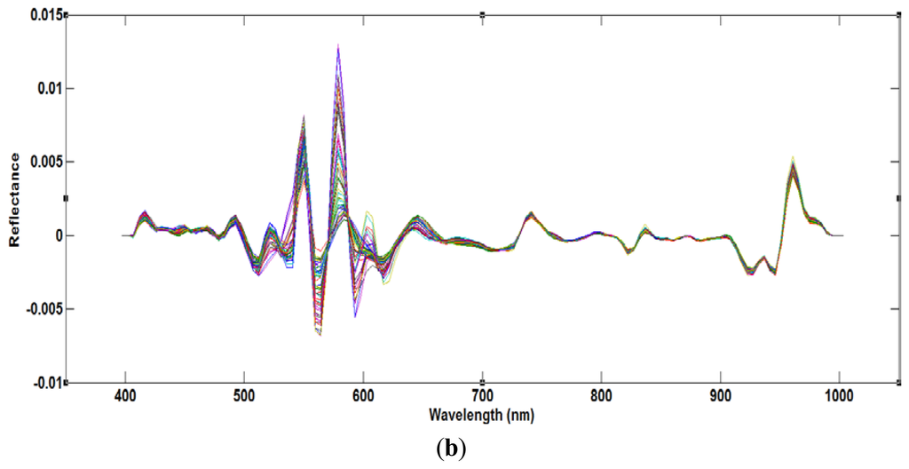 The raw data extracted from the hyperspectral imaging contained scattering noise generated from the camera. In order to overcome the scattering interference, we applied seven mathematical pre-treatments, such as normalization, standard normal variate (SNV) transformation, multiple scatter correction (MSC) and Savitzky-Golay filtering. The purpose of SNV is to remove the additive baseline and the multiplicative signal effects, transforming the spectrum with zero mean and variance equal to one. The aim of MSC is to remove the effect of physical light scatter from the spectrum (compensation for particle size effects). Finally, the Savitzky-Golay filter is a moving window method, which separates the overlapped peaks from the spectra.