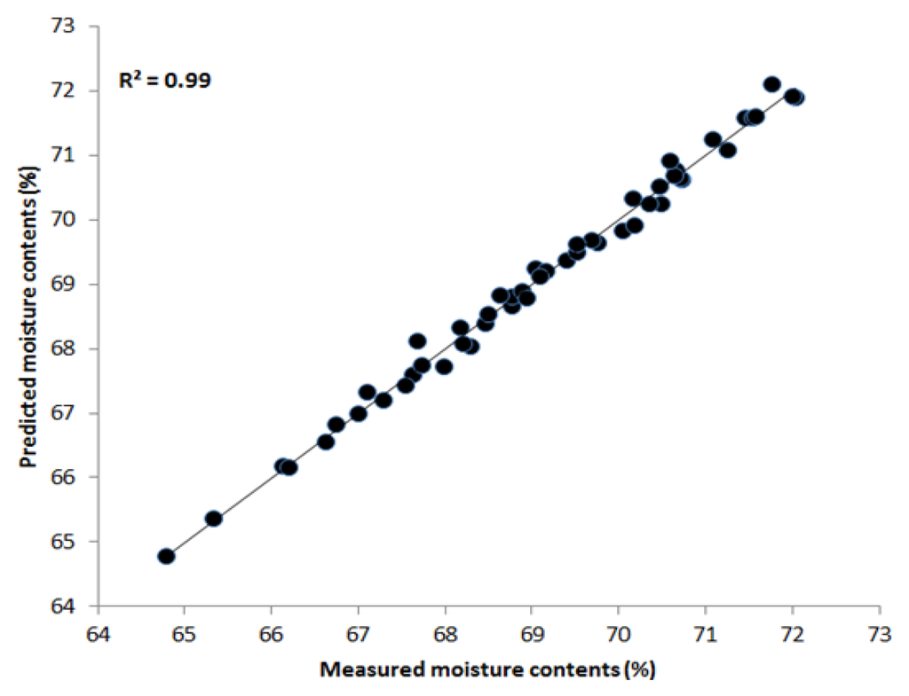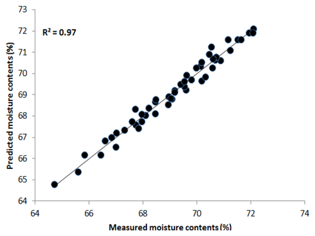 We applied similar PLSR multivariate techniques and preprocessing methods to estimate the moisture content of the chicken samples in the NIR region between 700 nm and 1,000 nm. Table 2 demonstrates that the maximum correlation coefficient values obtained by the Savitzky-Golay second derivative of R2 c and R2 p were 0.99 and 0.94, respectively. The SEC and SEP values were 0.15% and 0.71%, respectively. Figure 7 shows the prediction plot of moisture content where most of the points fall upon the regression line. These results suggest that the effective NIR region of 700–1,000 nm is better for predicting water content in the samples and for convenience during the analysis. Hence, HSI in combination with PLSR is an effective tool for determining chemical features in meat.