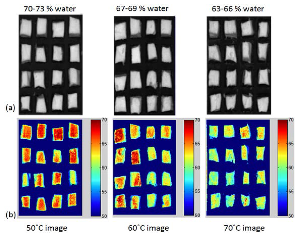 Figure 8 shows the final PLSR images of the moisture content of the chicken breast meat cooked at different temperatures. The images were constructed by multiplying the obtained beta coefficient (regression coefficient) from the PLSR model with the spectra of each pixel in the image. This image represents a water dispersion map in the chicken samples. The water content is higher in the central part of the sample than in the peripheral part. This observation is due to the higher contact with hot air around the peripheral part. Samples cooked at 50 °C contained 70%–73% water, while the 70 °C samples had a water content of 63%–66%. The difference between the samples is highly enhanced in the RGB images, shown in Figure 8b. As the temperature increased, a higher water loss occurred, which is indicated by the disappearance of the red pixels in the 70 °C images. This dehydration process from region to region cannot be visualized by any other conventional imaging technique. Therefore, HSI combined with image processing techniques can be used to clearly detect chemical changes in meat samples.