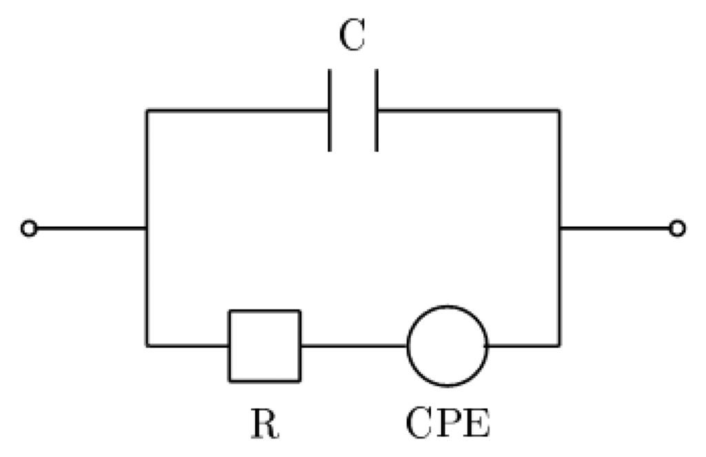 The obtained results were analyzed by means of the EEC approach. The impedance spectra of various EECs were fitted to the experimental data with the use of EIS Spectrum Analyzer software [33]. It was found that in all the cases, the optimal version of an EEC was a series combination of a resistor (R) and a constant phase element (CPE) connected in parallel to a capacitor (C). The scheme is depicted in Figure 2.