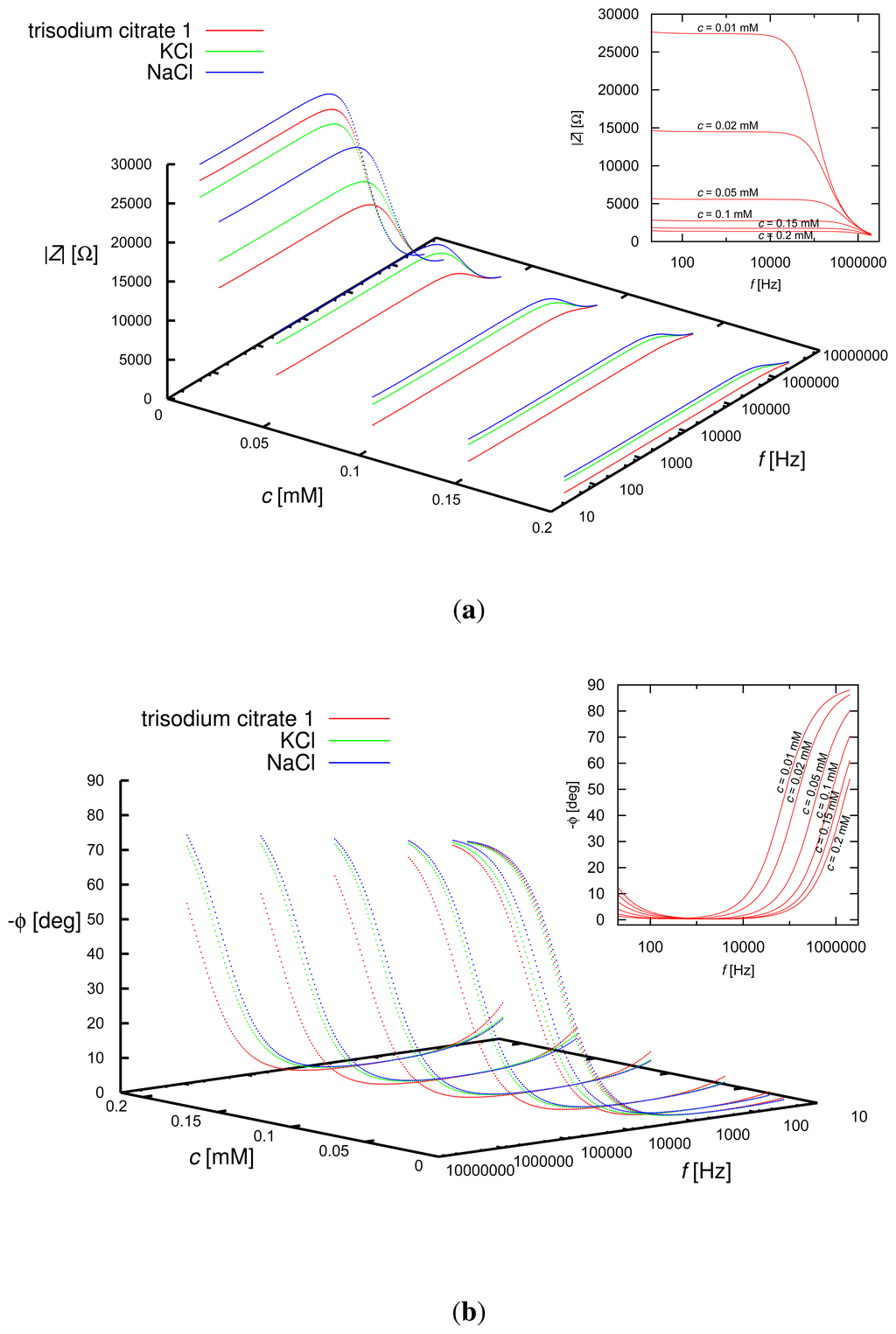 The frequency dependence of the magnitude and phase of the impedance, Z, of the sensor-liquid system for the KCl, NaCl and trisodium citrate solutions of various concentrations are shown in Figure 4. The dynamic range of the presented system is determined by the capabilities of the LCR meter, as well as the total capacitance of the measuring cell, which, in turn, depends on the geometry of the sensor. As can be inferred from the plots, both the magnitude and phase of the impedance depended on the concentration of the solutions, as well as on the type of the solute. The differences among the tested solutions were evident also for the electrical equivalent circuit parameters described in the next section.