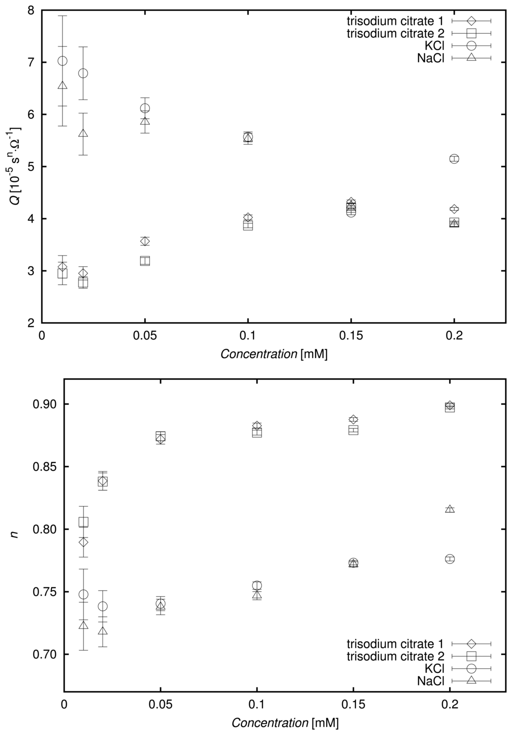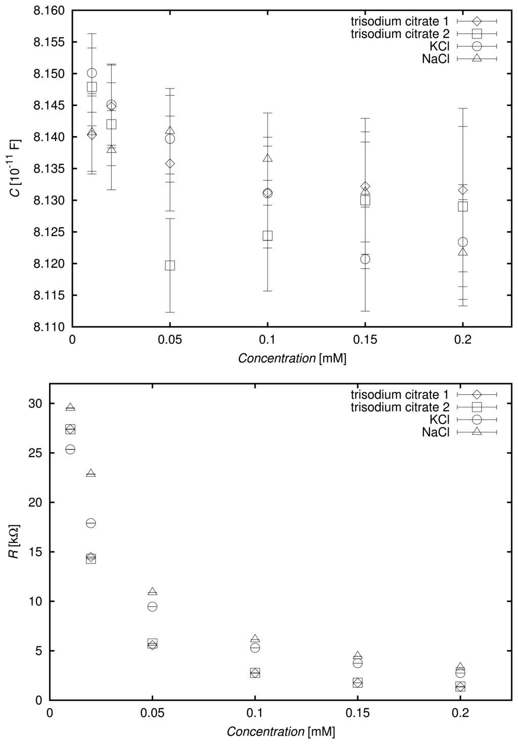 Figures 5 and 6 present the obtained values of parameters C, R, Q and n of the fitted EEC for the tested aqueous solutions of potassium and sodium chlorides and trisodium citrate of concentrations: 0.01, 0.02, 0.05, 0.1, 0.15 and 0.2 mM. Each of the trisodium citrate solutions was tested twice, exhibiting a very good repeatability in the results. The error bars in the figures represent standard errors of the determined EEC parameter values calculated using the EIS Spectrum Analyzer software [33].