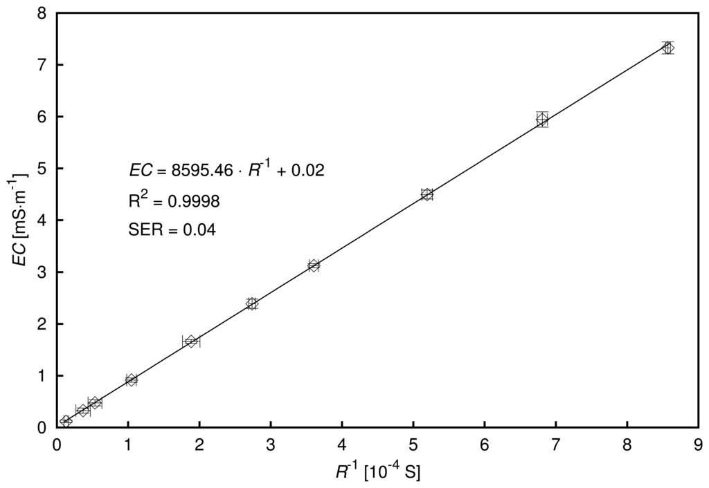 The obtained dependence of the measured electrical conductivity on R−1 was linear with a very high value of the coefficient of determination, R2, of 0:9998 and a standard error of regression, SER, of 0:04. This outcome proved that the designed sensor can be also used for accurate conductivity measurements and that the EEC was selected appropriately for the tested solutions. The calibration function for determining the electrical conductivity of low-concentrated solutions of interest is given in Figure 7.