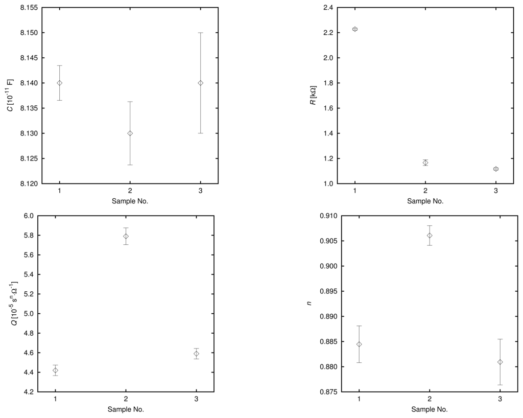 The obtained EEC parameters were very stable over the measured samples. The relative standard deviations were lower than 0.05%, 0.6%, 0.5% and 0.2% for capacitance, C, resistance, R, parameter Q and parameter n, respectively.