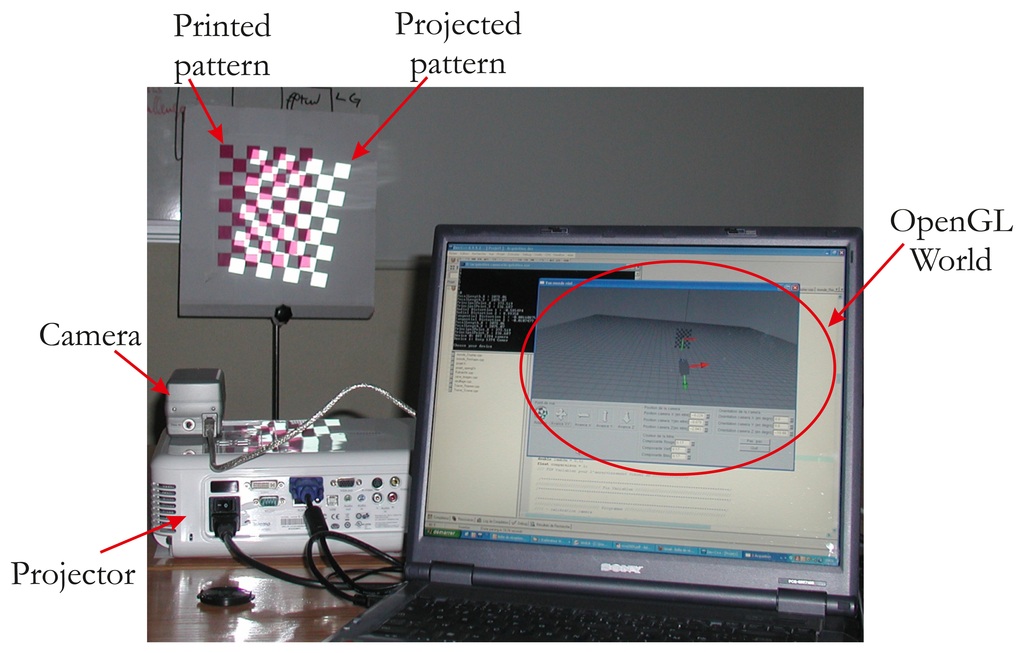 - Drareni, J.; Sturm, P.; Roy, S. Projector Calibration Using a Markerless Plane. Proceedings of the International Conference on Computer Vision Theory and Applications, Lisbon, Portugal, 5–8 February 2009; Volume 2, pp. 377–382.