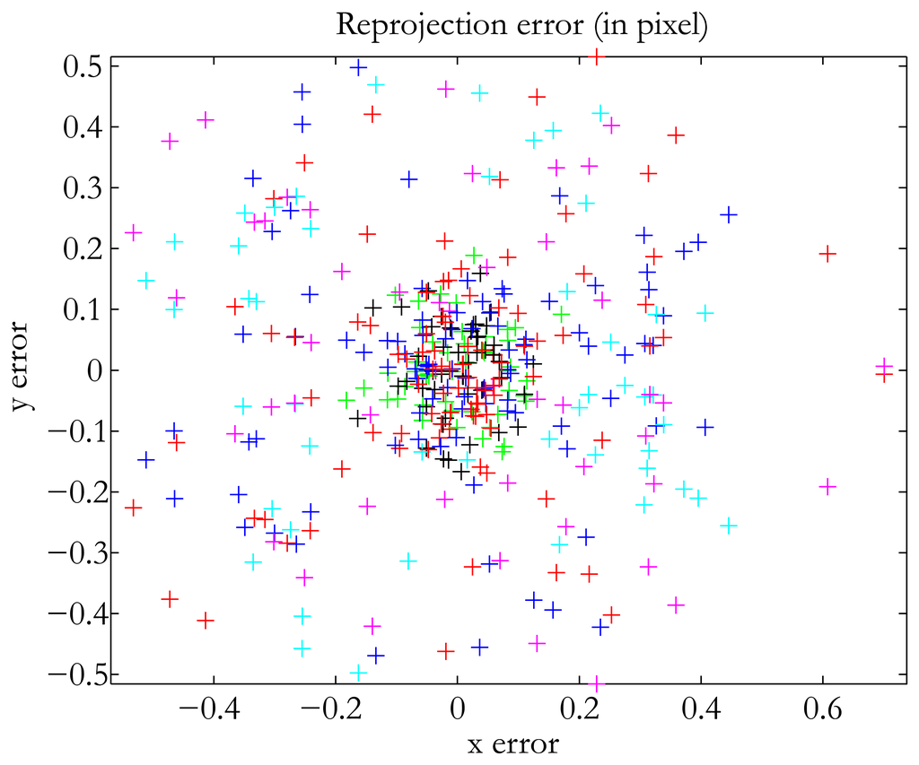 In terms of accuracy, our method falls in between the two already existing methods. The translation error was 0.47 mm, which is good when dealing with structured lighting applications, for instance. We used the same number of images as Audet and Okutomi. Of course, the addition of more images increases accuracy. The best result we obtained was 0.3 mm with 17 images. Our method was the easiest to use, since it does not impose any constraints on the position of the devices. In addition, we used no additional material, and the calibration pattern was a classical checkerboard. The method of Audet and Okutomi [15] was the most accurate of the three in calibrating the projector-camera system. The translation error was very low, as was the reprojection error. However, as indicated by the authors themselves, their method has one major drawback: the calibration board must be placed at angles of approximately 45° in relation to the image planes of the projector and the camera to maximize accuracy. Thus, the user must have experience in calibration tasks to perform the method satisfactorily. The plane-based method was the least accurate of the three tested. It is also the least user-friendly, because it takes a long time to process all the images. Finally, a quick comparison with the results obtained by the authors cited in the introduction shows that our method is not badly placed in terms of reprojection error for the projector (see Table 1). Figure 10 shows the distribution of our reprojection error.
