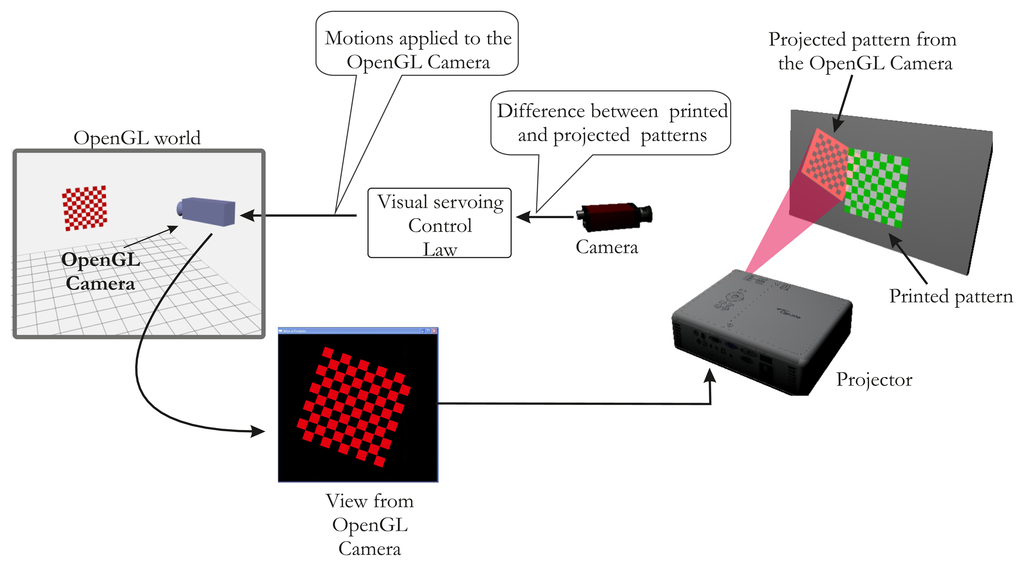 Here, the projector is viewing like a moving camera, which allows us to make the pattern of translation and rotation. The projector displays the same intrinsic parameters what the virtual camera sees. Thus, our method consists in projecting a calibration pattern and superimposing it on a known printed pattern with the aid of visual servoing (by moving the virtual camera, Figure 2). The same 3D points (i.e., the world points of the printed pattern) can be used for the camera and the projector, which considerably simplifies the process of projector calibration. In addition, the visual servoing task is able to minimize reprojection error on each point. A literature review showed that the accuracy of our method compares favorably with that of other techniques.
